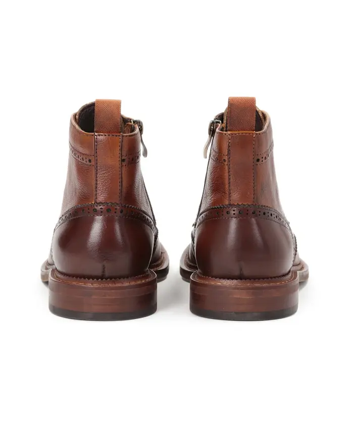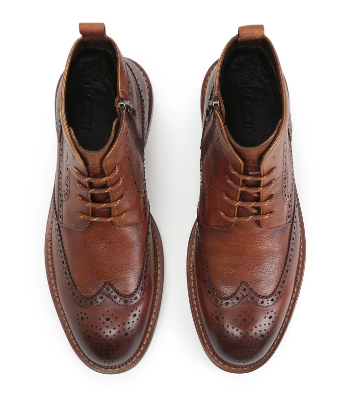 Коричневые мужские ботинки, украшенные дырочками в стиле броги, – классический крой мужских повседневных ботинок в современном исполнении. Изготовленные из высококачественной лицевой кожи, они идеально сочетаются с осенне-зимней городской одеждой. Помимо классической шнуровки, позволяющей подогнать обувь по ноге, эти ботинки оснащены застежкой-молнией, благодаря которой их надевать и снимать становится проще и быстрее. Внутренняя часть обуви, обшитая нежной овечьей кожей, гарантирует гигиенические условия и высокий уровень комфорта.