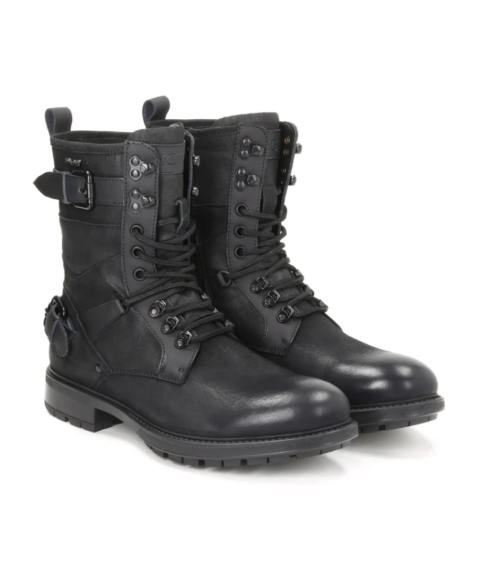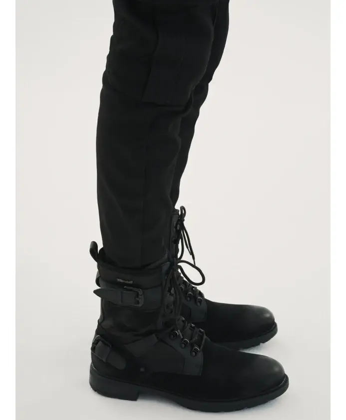 Мужские черные ботильоны из качественного нубука, кожи с матовой отделкой и текстильного материала вдохновлены мотоциклетным стилем. Экстравагантный вид придают выразительные нашивки с металлическими пряжками, высокие шнурки и крючки для шнурков. Привлекает внимание и замечательное сочетание контрастных материалов. Представленные ботинки прекрасно подойдут для повседневного городского стиля. Застегивается на молнию на внутренней стороне верха. Изнутри утеплен технологией Thinsulate, которая обеспечивает чрезвычайно эффективное удержание тепла благодаря большему количеству воздушных карманов.