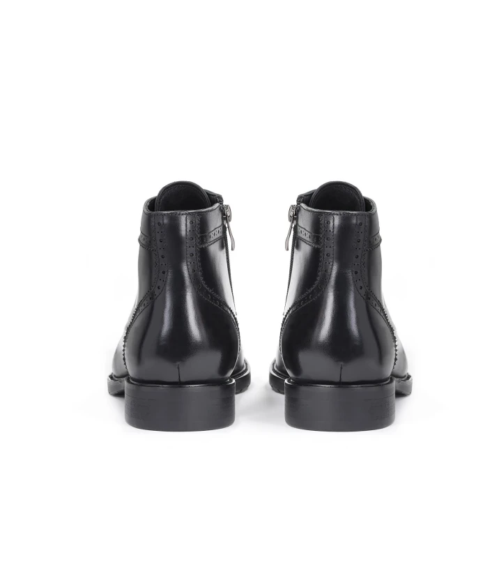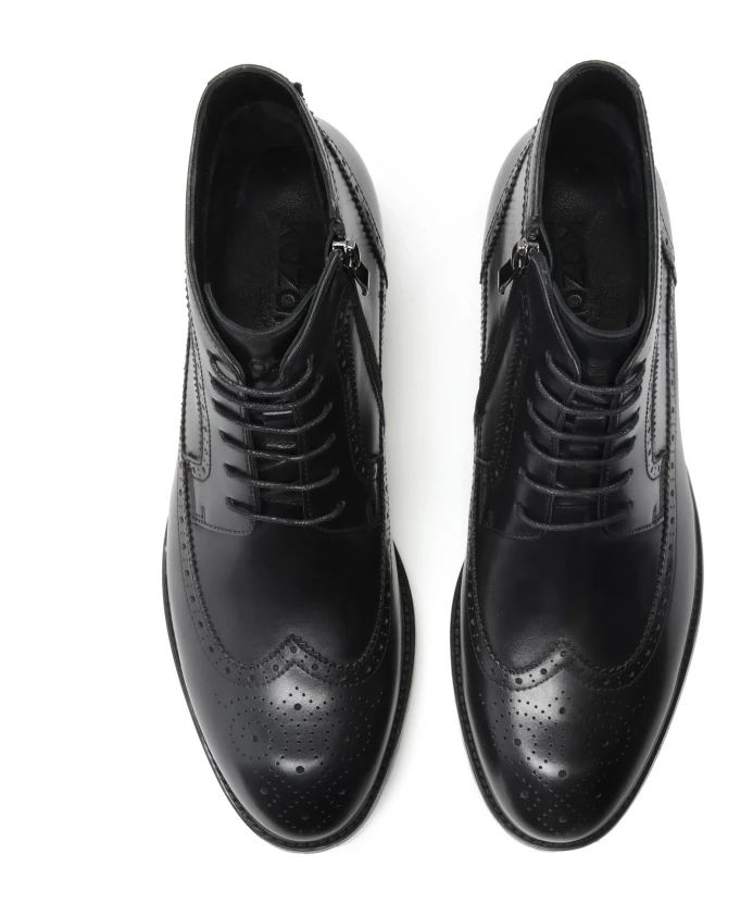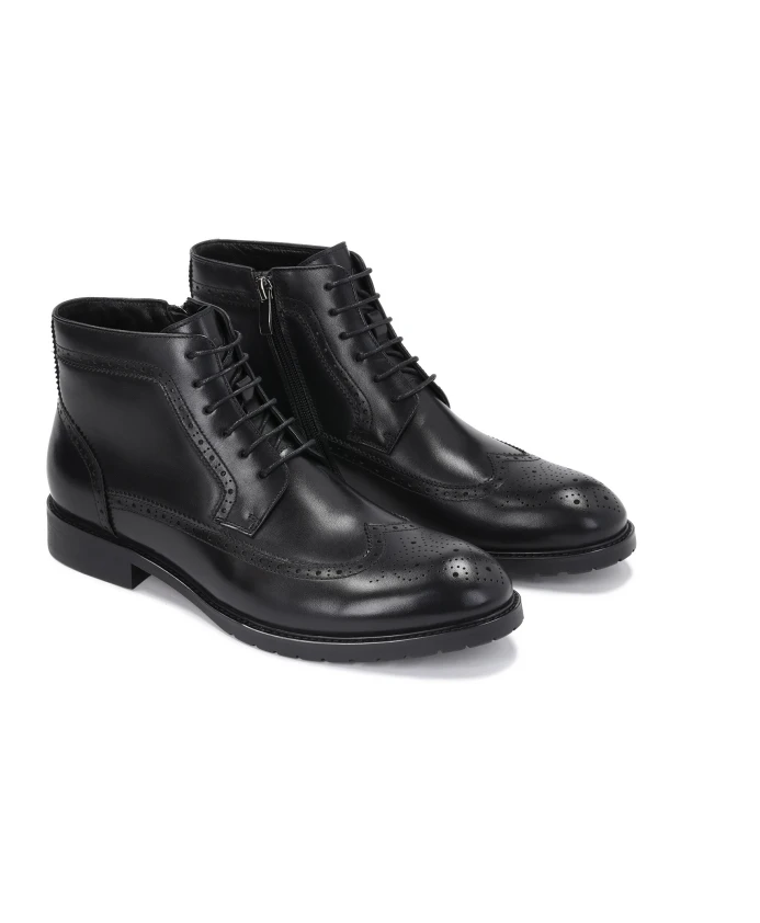 Мужские ботинки на шнуровке с голенищем выше щиколотки – привлекательный элемент как повседневного, так и более формального наряда. Тонкая розетка сверху и нити, украшенные декоративными отверстиями, придают минималистичному топу простого кроя некую непринужденность. Высококачественная лицевая кожа, из которой изготовлены эти ботинки, отличается долговечностью и эстетичным внешним видом. Классический черный цвет подчеркивает универсальность этой модели. Подкладка из мягкой овчины гарантирует высокий уровень комфорта, а тканевая подкладка обеспечивает тепло в холодные дни.