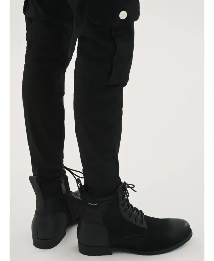 Мужские черные ботильоны из высококачественного нубука, текстильного материала и прорезиненной кожи вдохновлены стилем милитари. Классический крой с высокой шнуровкой привлекает внимание интересным сочетанием контрастных материалов. Представленные ботинки прекрасно подходят для повседневного использования, городского стиля. Обувь закрывается на молнию с внутренней стороны верха. Внутренняя часть обуви утеплена технологией Thinsulate, которая обеспечивает чрезвычайно эффективное сохранение тепла благодаря большему количеству воздушных подушек.
