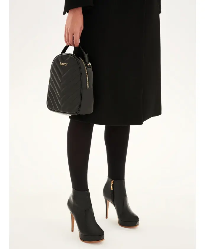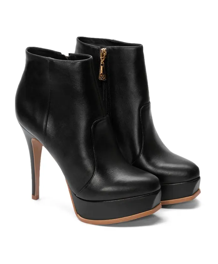 Женские черные ботинки из высококачественной кожи с верхом идеально подойдут женщинам, желающим подчеркнуть свою уверенность в себе и сильный характер. Чрезвычайно высокий каблук нейтрализован элегантной подошвой на платформе, обеспечивающей комфорт при ходьбе. Стелька из чрезвычайно мягкой овчины гарантирует комфорт.