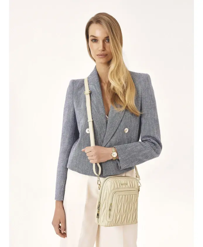 Сумка, изготовленная из высококачественной лицевой кожи нейтрального бежевого цвета, имеет привлекательную форму и характерный стеганый узор, придающий ей элегантный и роскошный вид. Квадратная форма с двусторонней молнией и швами по краям не только хорошо выглядит, но и, прежде всего, удобна в ношении. Регулируемый ремень позволяет носить его через плечо или через плечо. Подробности о товаре: Сумка имеет 1 основное отделение, закрывающееся на молнию. Внутри отделение с 24 отделениями для карт, 1 карманом на молнии и 2 открытыми карманами. На передней части сумки расположен большой карман на молнии. Сумочка оснащена защитными металлическими ножками. Ремешок съемный и регулируемый.