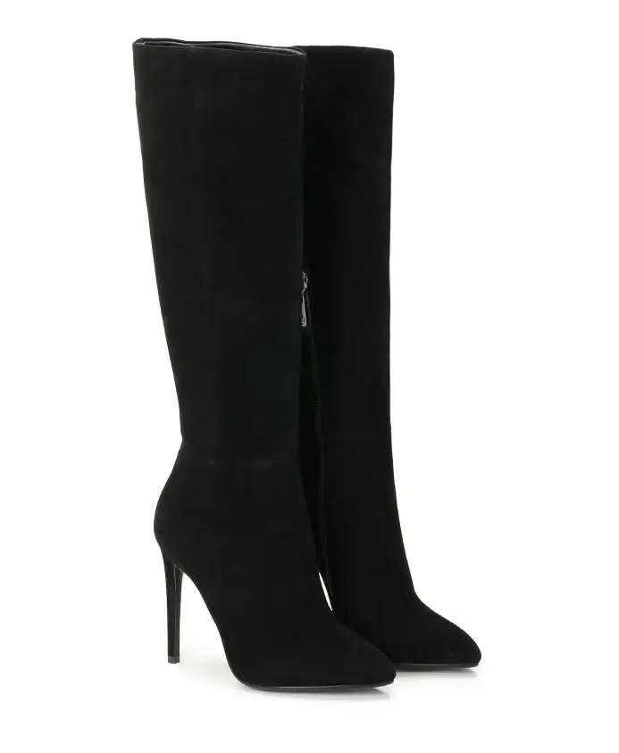 Высокие женские сапоги из высококачественной замши представляют собой элегантный классический крой на высоком каблуке. Минималистский топ с тонкими нитями в сочетании с зауженным кончиком делает ноги стройнее и длиннее. Универсальный, неподвластный времени черный цвет подойдет ко всему. Благодаря исключительным влагопоглощающим свойствам подкладка из полуанилиновой овчины обеспечивает высокий уровень комфорта.