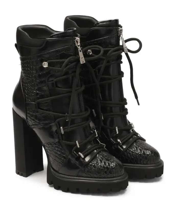 Черные кожаные женские сапоги с тиснением – это очень стильная и яркая обувь, которая обязательно привлечет внимание. Кожа с тиснением животного рисунка придает ботинкам неповторимый характер и модный вид, сочетающий элегантность с оттенком грусти. Сапоги на высокой платформе-шпильке привлекательны и практичны и идеально подходят для самых разных случаев: от повседневного стиля до вечерних выходов в свет. Верх ботинок оснащен молнией и шнурками. Молния позволяет легко надевать и снимать ботинки, а шнурки идеально прилегают к ноге, обеспечивая комфорт и поддержку. Кроме того, внутренняя часть обуви утеплена, что гарантирует тепло и комфорт в холодные дни, что делает ее идеальным выбором для осени и зимы. Мягкая подкладка из овчины гарантирует высокий комфорт, а меховая подкладка из тонкой ткани согревает в холодные дни.