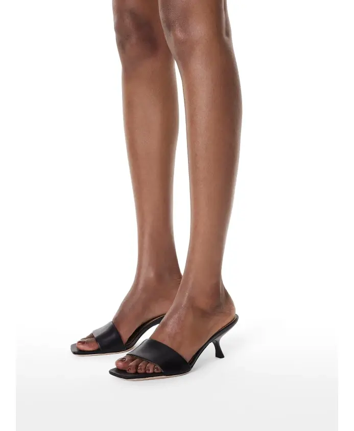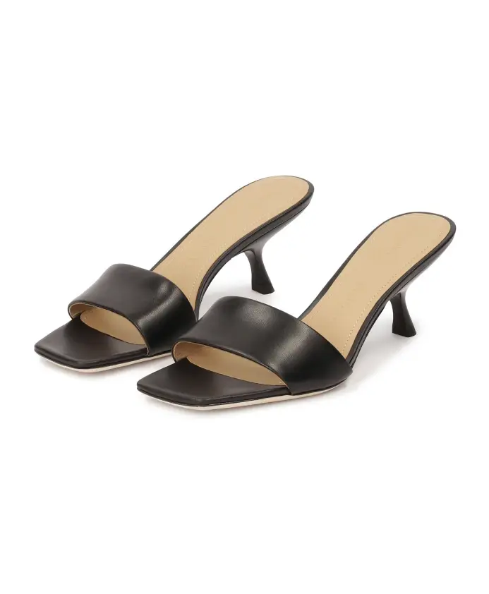 Мюли на невысоком каблуке интересной формы – привлекательное дополнение летней моды. Минималистичный, но элегантный дизайн идеально подходит для различных случаев. Мюли изготовлены из высококачественной лицевой кожи универсального черного цвета. Модным элементом является квадратный носок, завершающий оригинальный характер обуви. Подкладка из полуанилиновой овчины обеспечивает исключительный комфорт благодаря отличным свойствам поглощения влаги. Кожаная подошва отличается эстетичным внешним видом.
