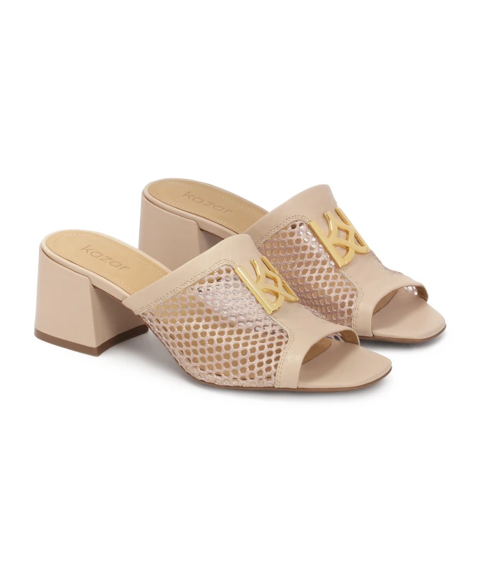 Мюли на широком каблуке – удобный и стильный вариант для летнего сезона. Широкий ремешок из воздушной тканевой сетки и лицевой кожи обеспечит комфорт в жаркие дни. Сочетание нейтрального бежевого цвета и шикарного золота придает обуви универсальный, вневременной характер. Мюли на каблуке – интересная альтернатива классическим босоножкам. Подкладка из тонкой полуанилиновой козьей кожи гарантирует исключительный комфорт. Подошва из тунисской кожи отличается долговечностью и эстетичным внешним видом.