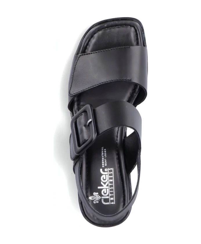 Прогуляйтесь стильно с черными кожаными женскими сандалиями на плоской подошве от Rieker. Эти сандалии идеально подходят для взрослых, удобные и стильные. Код товара: 62663-01.
