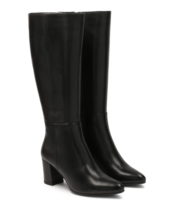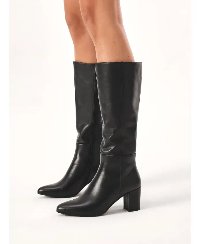 Черные ботинки из натуральной кожи отличаются элегантным и неподвластным времени дизайном. Посаженные на прочную шпильку, они придают силуэту стройность и уверенность в себе. Тонкое голенище длиной до колена оснащено длинной молнией, которая позволяет легко надевать и снимать изделие и обеспечивает идеальную посадку. Удлиненный носок придает обуви изысканный вид и подчеркивает ее элегантность и стиль. Эти ботинки идеально подходят для повседневной носки и особых случаев. Они хорошо сочетаются с различными стилями, от повседневного до формального. Мягкая подкладка из овчины гарантирует высокий комфорт, а подкладка из тканевого меха обеспечивает ощущение тепла в холодные дни.