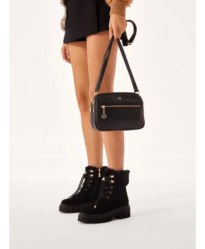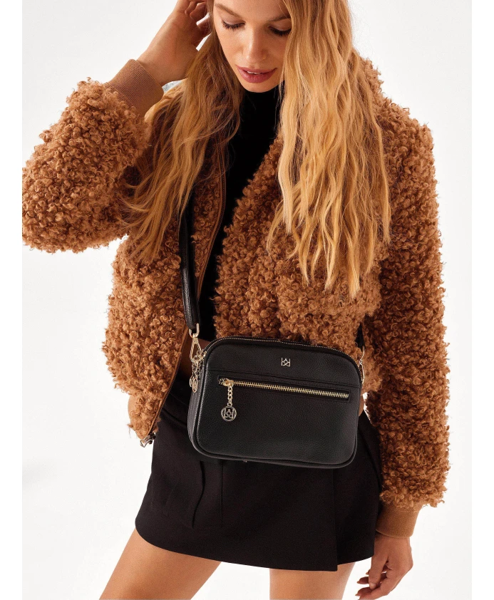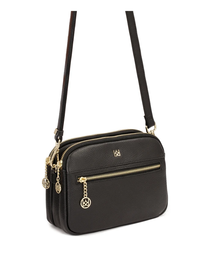 Сумочка из высококачественной лицевой кожи – это классическая и вневременная модель на длинном ремешке, которая благодаря своим компактным размерам идеально подходит для повседневного использования. Сочетание черной кожи с золотистыми элементами выглядит элегантно и стильно. Три отделения и дополнительные карманы позволяют идеально организовать вещи, которые вы носите. Подробности о товаре: Сумка имеет 3 отдельных отделения, в том числе 2 на молнии и 1 на магнитной застежке. Внутри 2 открытых кармана и 1 карман на молнии. На передней части сумки расположен карман на молнии. Ремешок съемный и регулируемый.
