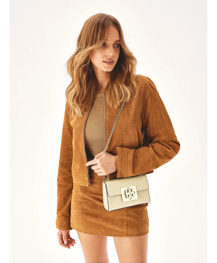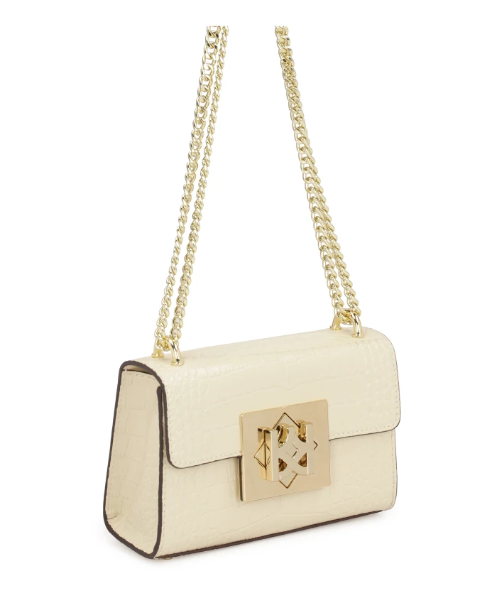 Небольшая сумочка кремового цвета выделяется золотистыми деталями в виде крупной застежки с монограммой KAZAR и золотой цепочки на плечо. Качественная кожа с рисунком крокодила выглядит оригинально и чрезвычайно стильно. Благодаря прочной конструкции сумка сохраняет безупречный внешний вид и защищает находящиеся внутри предметы от повреждений. Эта неподвластная времени модель порадует женщин, которые ищут аксессуары, сочетающие классическую элегантность с современным дизайном. Подробности о товаре: Сумочка имеет 1 отделение, которое закрывается клапаном на поворотный замок. Внутри 1 карман на молнии. Сумочка оснащена металлическими ножками. Цепочка не съемная, но ее можно перемещать. Его можно переделать в длинную ручку для плеча или две ручки для удержания в руке.