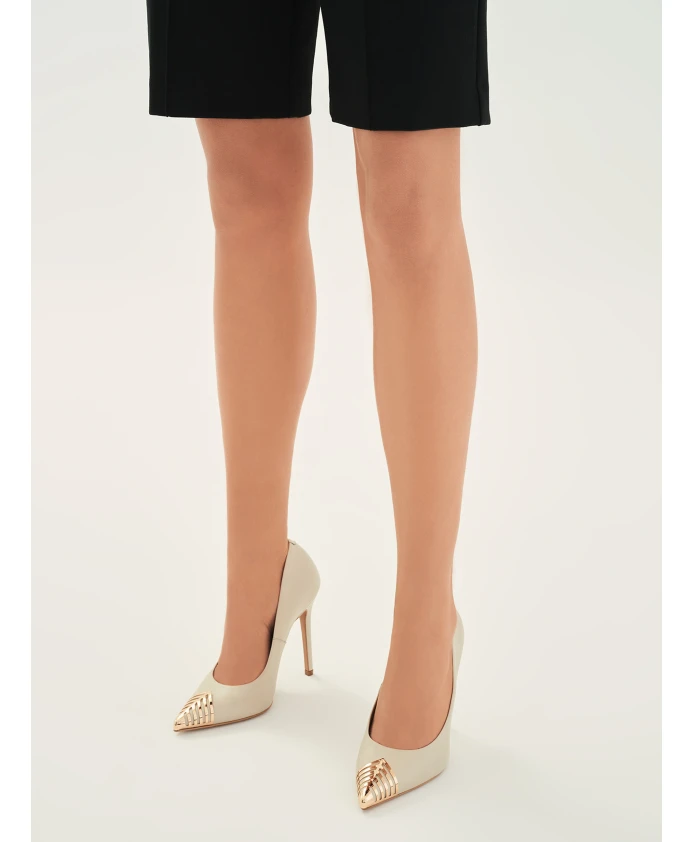 Неподвластные времени туфли-лодочки на тонком высоком каблуке являются незаменимым элементом гардероба каждой женщины. Нейтральный цвет позволяет им сочетаться с большинством стилей. Представленная модель из высококачественной лицевой кожи – это классика в современном дизайне. Острый носок украшен красивой металлической вставкой интересного лазурного цвета. Сочетание бежевого и золотого – тонкое, элегантное и стильное. Подошва Microlite отличается долговечностью и эстетичным внешним видом. Благодаря своей исключительной способности впитывать влагу подкладка из полуанилиновой овчины обеспечивает исключительный комфорт.