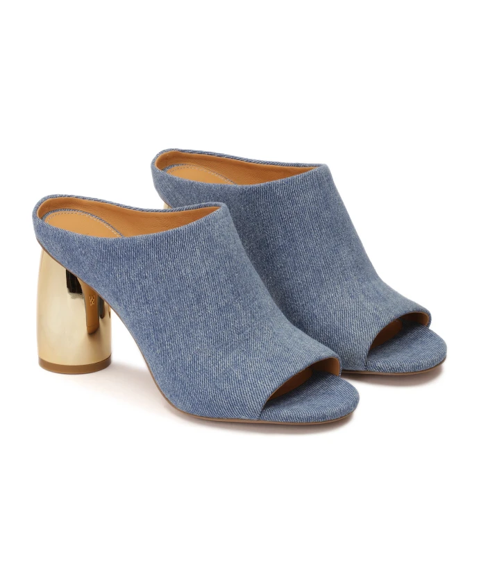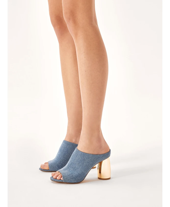 Мюли из качественной джинсовой ткани – оригинальное, привлекающее внимание предложение для летнего сезона. Встроенный верх привлекательно смотрится на ноге, а овальный золотистый каблук придает всей модели элегантность и шик. Сочетание синего и золотого необычно и в чем-то очаровательно. Мюли на широком каблуке удобны, очень женственны, они могут с успехом заменить классические босоножки и туфли-лодочки. Подкладка изготовлена из полуанилиновой овчины, которая отличается отличным впитыванием влаги. Подошва изготовлена из прочной кожи Tuniscus, что гарантирует долгий срок службы обуви.
