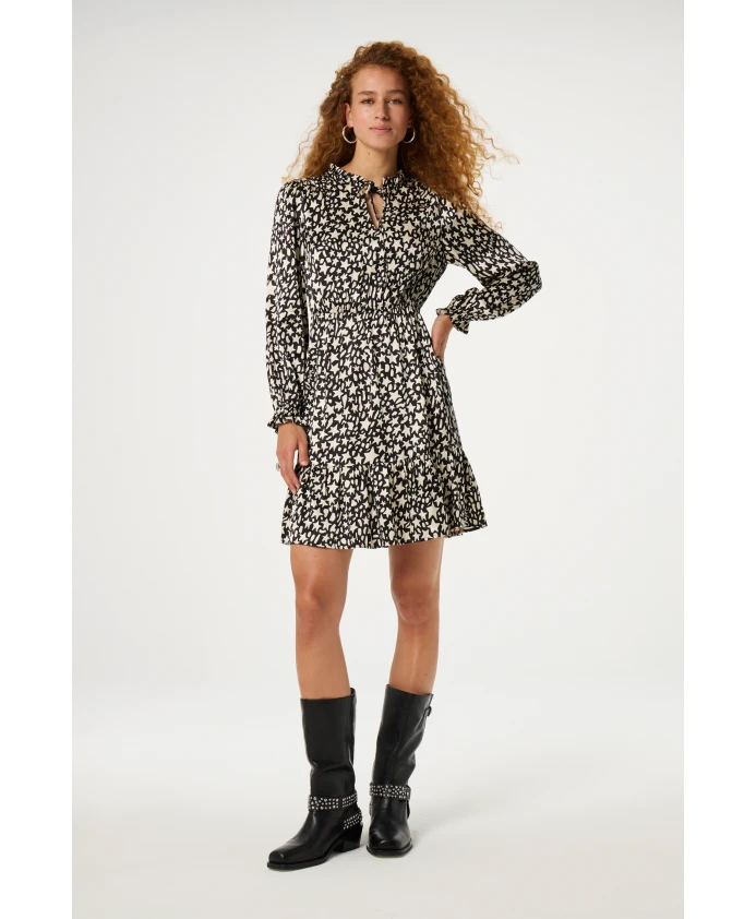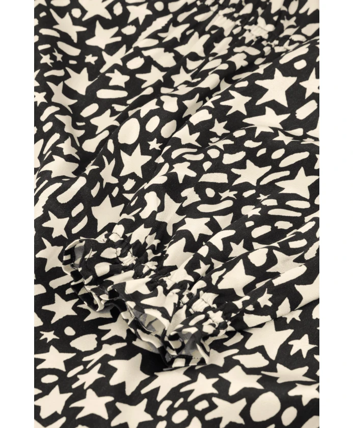 Короткое женское платье с эластичной талией, V-образным вырезом, эластичными манжетами и длинными рукавами с черно-белым узором в виде звезд. Изготовленный из 51% вискозы (LENZING ECOVERO) и 49% вискозы, это один из наших наиболее экологичных стилей. Легкое дополнение к любому гардеробу, идеальное для непринужденного образа.