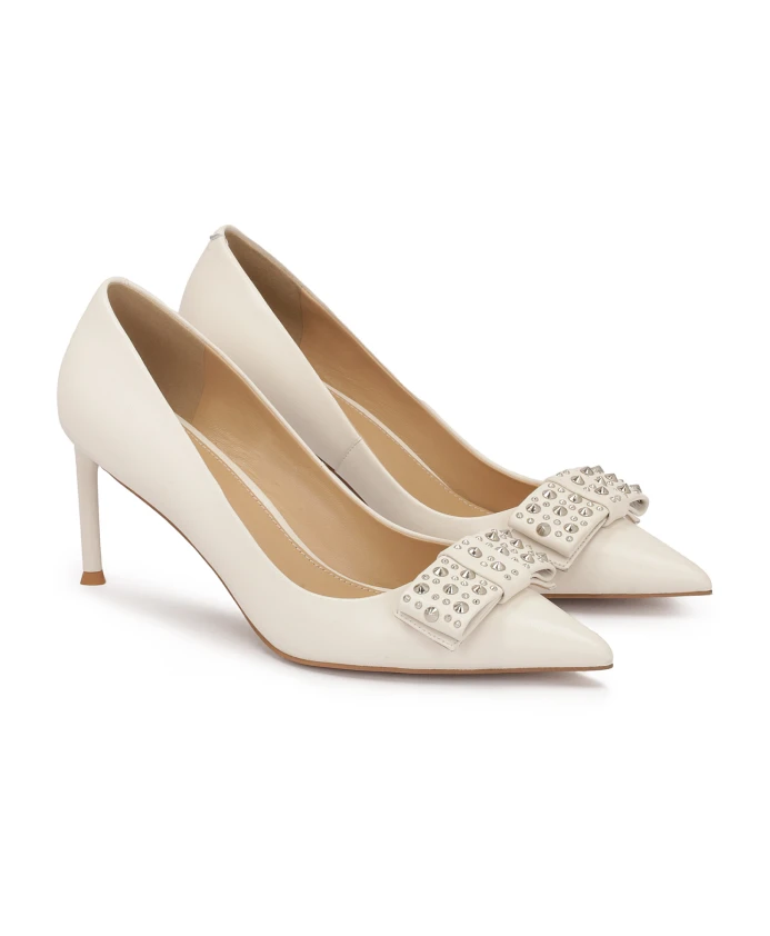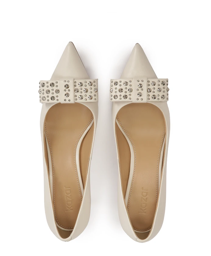 Элегантные кремовые туфли из натуральной кожи – это квинтэссенция изысканности и шика. Их заостренные носы и узкие каблуки подчеркивают женственную грацию и шик, придают образу утонченность. Характерными элементами этой модели являются крупные банты на носах, украшенные серебряными стразами. Яркие туфли на шпильке идеальны как для вечерних нарядов, так и для более формального образа на работе или для особых случаев. Их уникальный дизайн делает их чрезвычайно привлекательными и желанными для женщин, которые ищут элегантность и неповторимый стиль. Подкладка из полуанилиновой овчины обеспечивает исключительный комфорт благодаря отличным свойствам поглощения влаги. Тонкая кожаная подошва гарантирует долговечность, прочность и эстетичный внешний вид обуви.