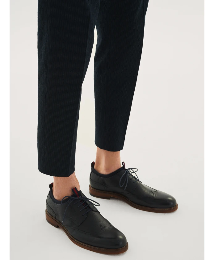 Мужские темно-синие туфли дерби из высококачественной натуральной кожи станут идеальным выбором для каждого стильного мужчины. Эта вневременная модель станет прекрасным дополнением к любому повседневному наряду.