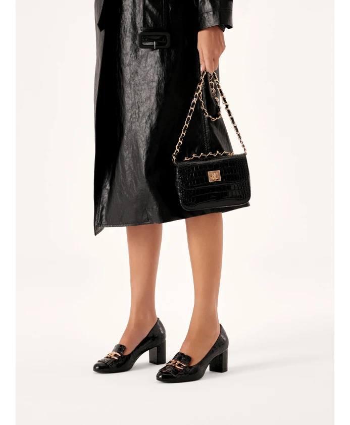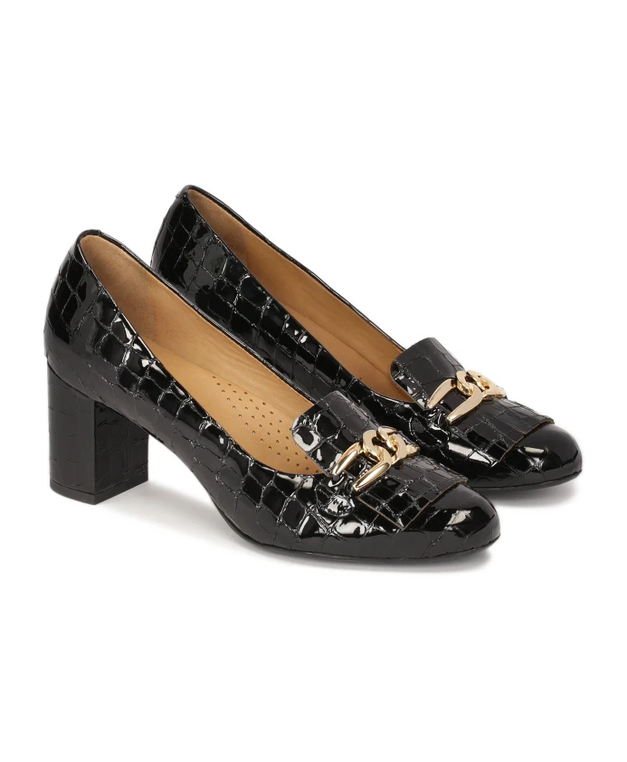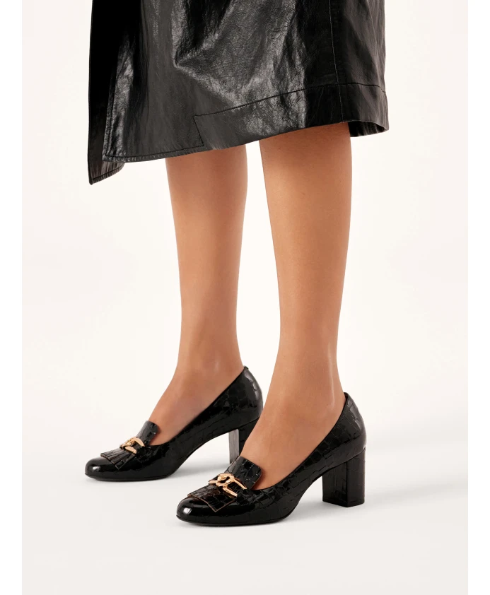 Эти туфли-лодочки на шпильке станут идеальным выбором для женщин, которые ценят безупречный внешний вид и комфорт. Тисненая лаковая кожа подчеркивает ее необыкновенный, неповторимый характер. Основное украшение состоит из металлических звеньев и цепочки золотого цвета. Туфли-лодочки идеально дополнят формальный, деловой и повседневный стиль. Перфорированная комфортная стелька из полуанилиновой козьей кожи обеспечивает исключительный комфорт благодаря отличным свойствам поглощения влаги.