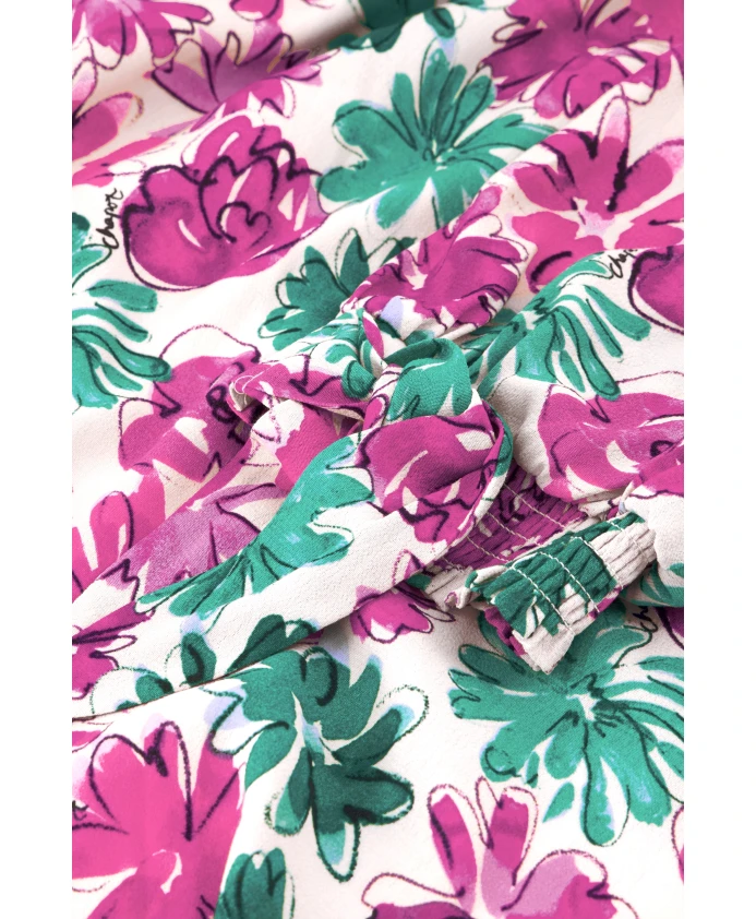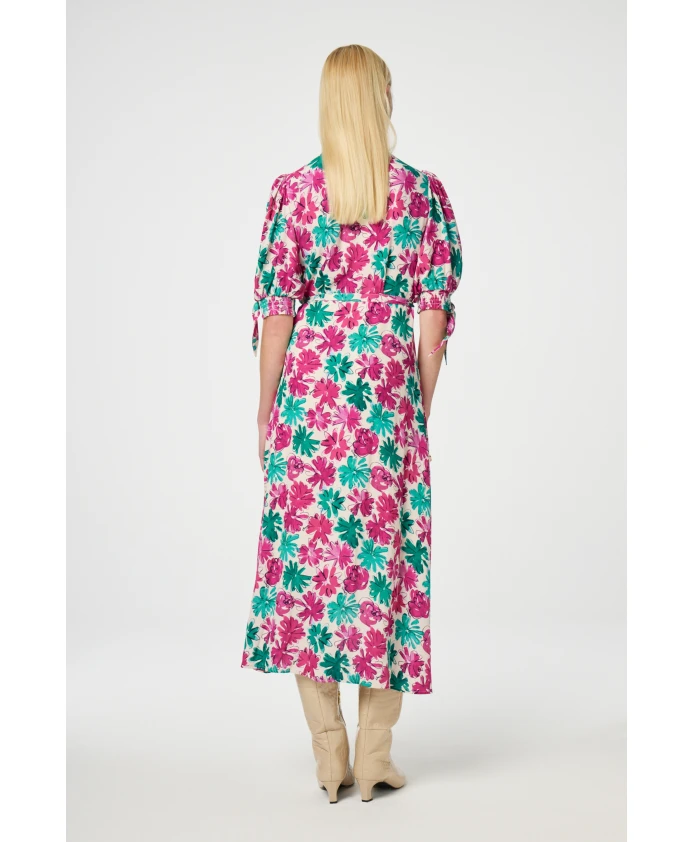 Это женское платье с запахом имеет привлекательный V-образный вырез, короткие рукава-фонарики и зелено-розовый цветочный узор. Платье имеет длину миди, женственный крой и выполнено из 54% вискозы LENZING ECOVERO и 46% вискозы, что делает его одним из наших наиболее ответственных стилей. Дополните свой образ стильными туфлями на каблуке или ботинками.