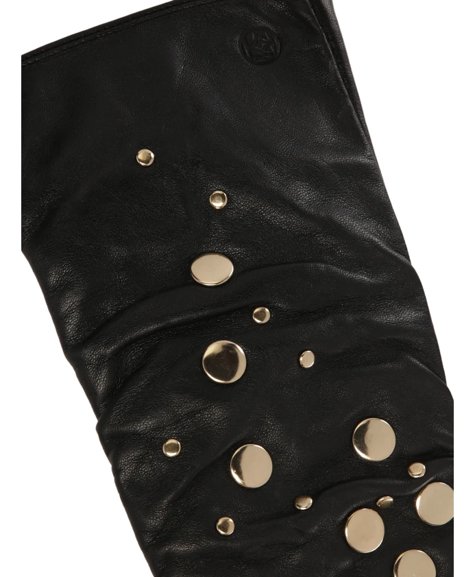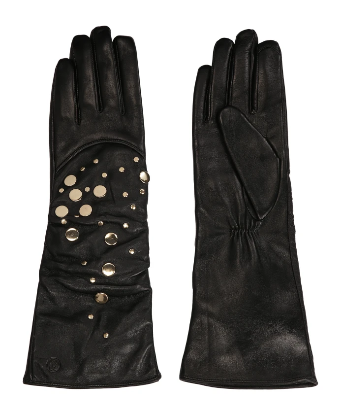 Эксклюзивные длинные женские перчатки из тонкой натуральной кожи выглядят исключительно элегантно благодаря декоративным круглым заклепкам разных размеров золотого цвета. Их стильный дизайн гармонично сочетает в себе классическую элегантность и современность. Кроме того, перчатки оснащены функцией сенсорного экрана, которая позволяет пользоваться смартфонами и планшетами, не снимая их, обеспечивая комфорт и удобство в холодные дни. Длина перчаток обеспечивает дополнительную защиту от холода, защищая как кисти рук, так и часть предплечий. Они прекрасно сочетаются с элегантным пальто и модной курткой и станут стильным акцентом любого зимнего наряда.
