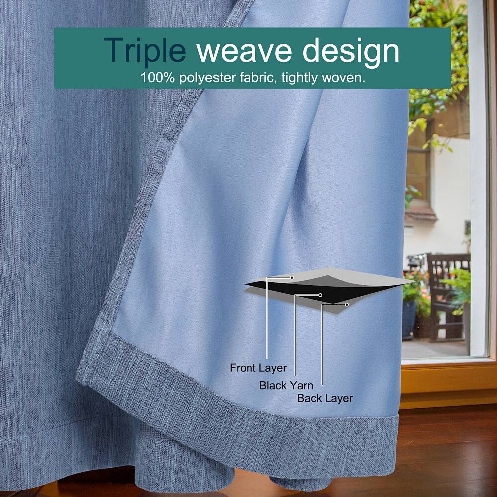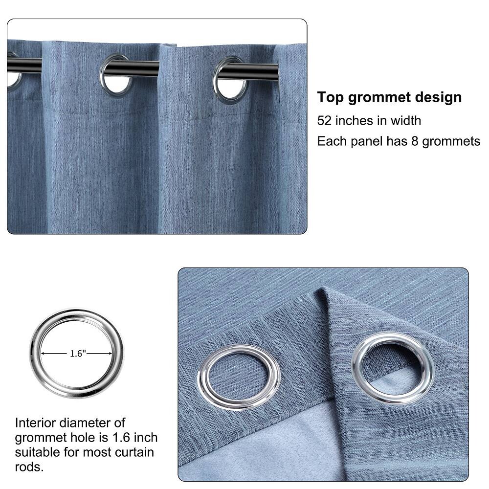 Лицевая сторона наших плотных штор изготовлена ​​из полиэстера, плотного плетения и превосходно обрабатываемого, а задняя сторона также имеет тонкую и гладкую текстуру. 3 слоя придают этой шторе сильный эффект затемнения, а также могут снизить шум. Несмотря на наличие множества структур, специфического запаха нет. Наши шторы широко распространены и могут использоваться в гостиной, во время обеденных перерывов или для людей, которые не могут спать из-за шума и так далее. В верхней части этой занавески имеются 8 никелевых прокладок (внутренний диаметр 1,6 дюйма), что обеспечивает простоту установки и плавное скольжение.