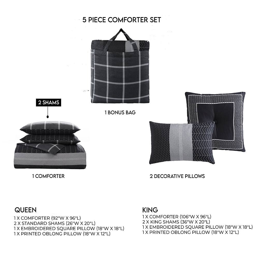 Двусторонний комплект одеял Bebejan Kyle из 5 предметов с узором «елочка» и твид идеально подходит для более мужественного образа в вашей комнате. Яркие полосы на высококачественном 100% хлопковом сатине плотностью 200 нитей выполнены в оттенках черного и серого, создавая современный или переходный вид. Спинка превращается в клетчатый принт на оконном стекле, создавая два универсальных образа. В комплект входит 1 двустороннее одеяло, 2 накладки на молнии и 2 декоративные подушки. Одна подушка расшита тафтинговой пуговицей, а другая напечатана.
