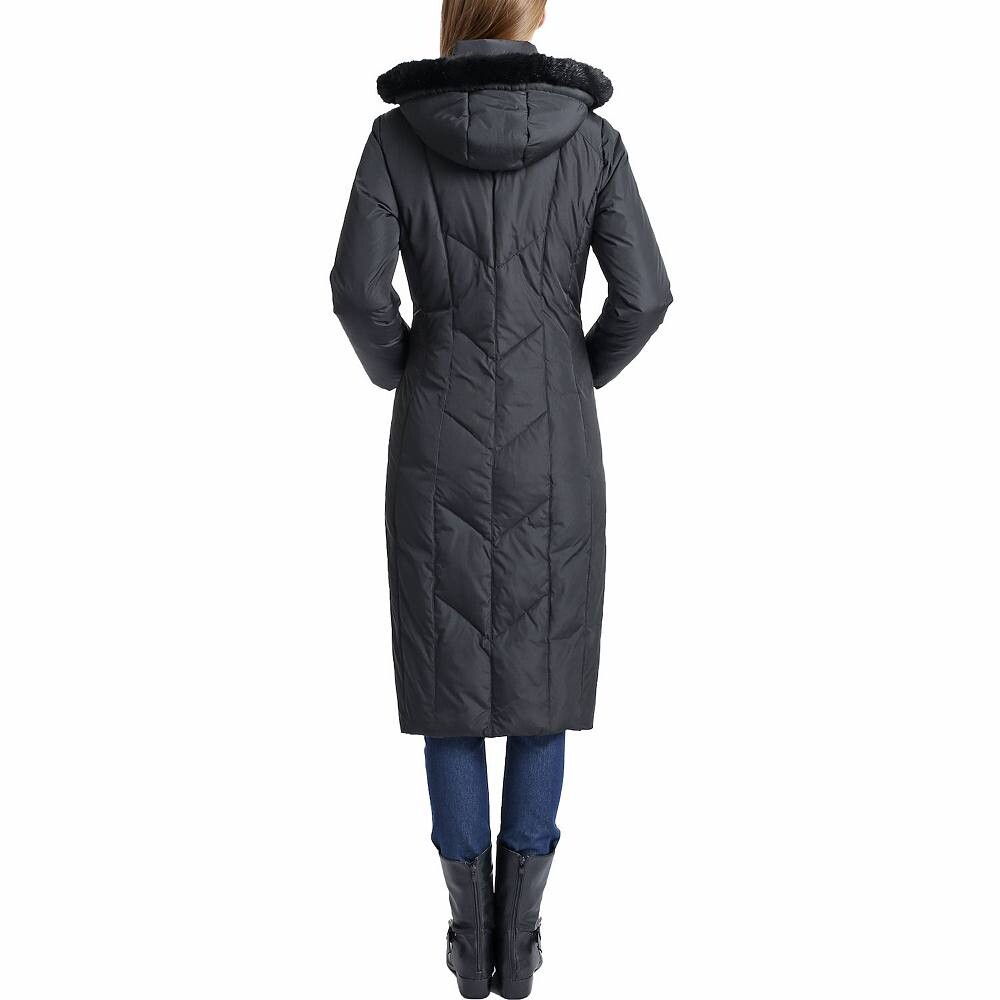 Стеганые швы с шевронным рисунком создают теплое пуховое пальто с отделкой из искусственного меха на отстегивающемся капюшоне. Потайные трикотажные манжеты.