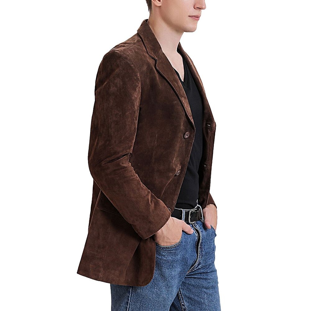 Классический пиджак станет прекрасным дополнением практически к любому наряду. В нем использована мягкая замша. Изысканный крой, воротник с вырезом, естественные плечи и передняя часть с тремя пуговицами. Два двойных кармана с клапанами; один нагрудный карман.