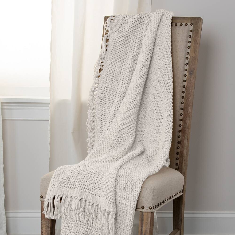 Этот плед сплетен в открытый, плотный сетчатый узор. Это все один цвет пряжи. Два края представляют собой кромки, два других имеют длинную бахрому, завязанную вручную в виде кисточек. Плоская тканая полоса перед кистью гарантирует, что даже несмотря на неплотное плетение, форма покрывала сохранится при длительном использовании и стирке.