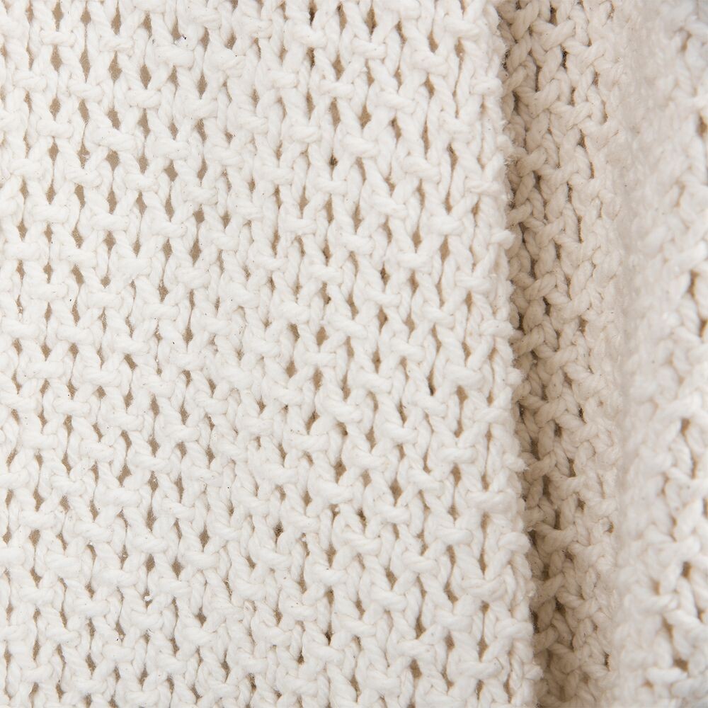Этот плед сплетен в открытый, плотный сетчатый узор. Это все один цвет пряжи. Два края представляют собой кромки, два других имеют длинную бахрому, завязанную вручную в виде кисточек. Плоская тканая полоса перед кистью гарантирует, что даже несмотря на неплотное плетение, форма покрывала сохранится при длительном использовании и стирке.