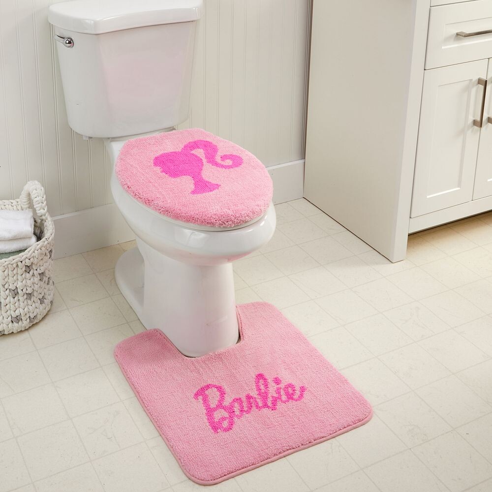 Украсьте свою ванную комнату с помощью этого милого коврика для ванной Barbie Script Contour и набора крышек для унитаза с силуэтом.