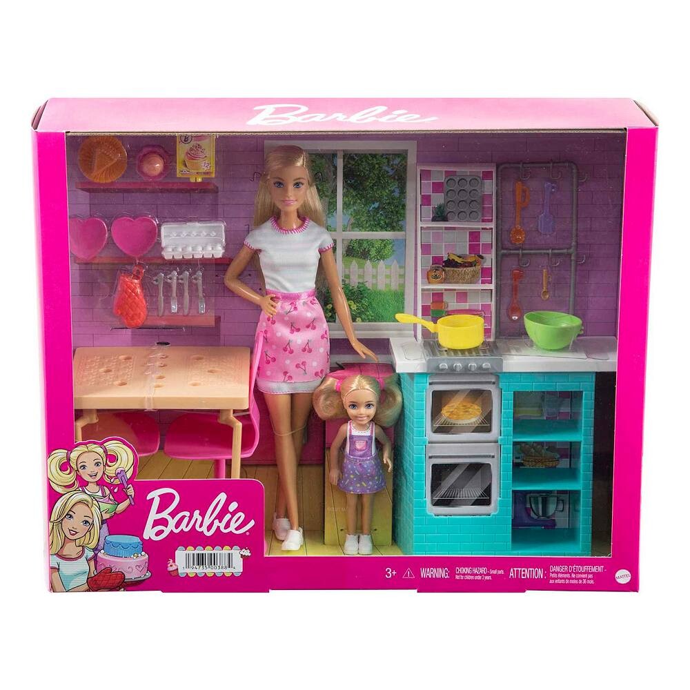 Дети смогут приготовить самые разные развлечения с помощью этого набора для выпечки Барби, в который входят кукла Барби, кукла младшая сестра Челси и все необходимое для создания сладких угощений!