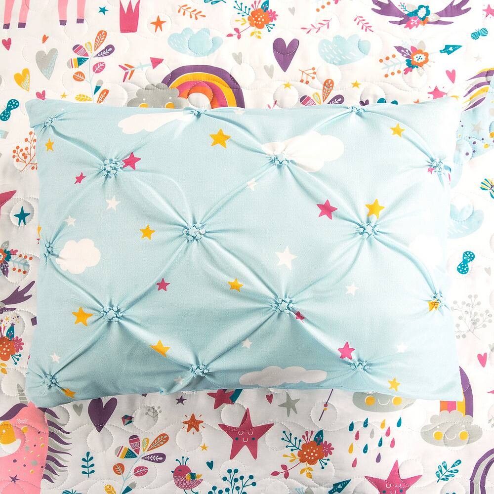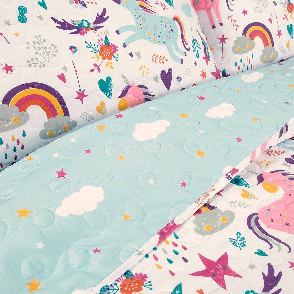 Подарите своему ребенку спальню прямо из сказки с помощью этого очаровательного комплекта двусторонних одеял с единорогами, радугой, сердечками и многим другим, напечатанными на мягкой микрофибре. Это обязательно разбудит воображение! Две уникальные декоративные подушки завершают образ.