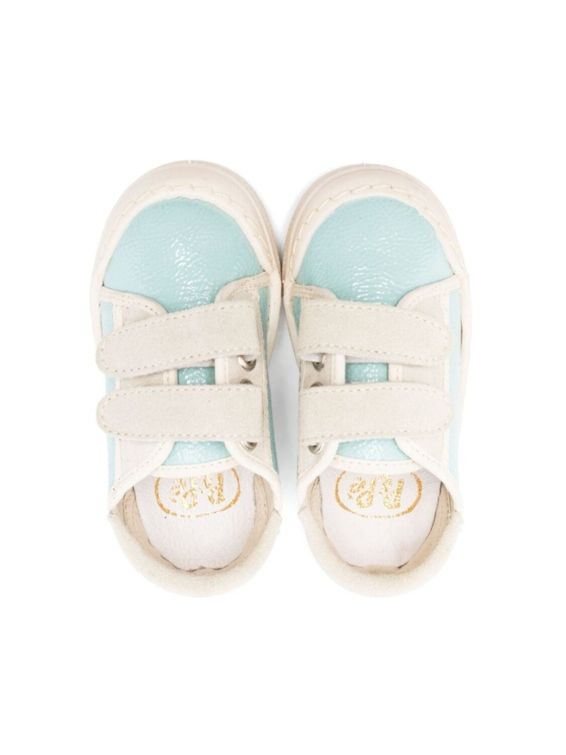 Телячья кожа небесно-голубого/светло-серого/кремового цвета с блестящей отделкой, вставки из замши, круглый носок, резиновый подносок, застежка на липучке спереди, хлопковая подкладка, фирменная кожаная стелька, плоская резиновая подошва