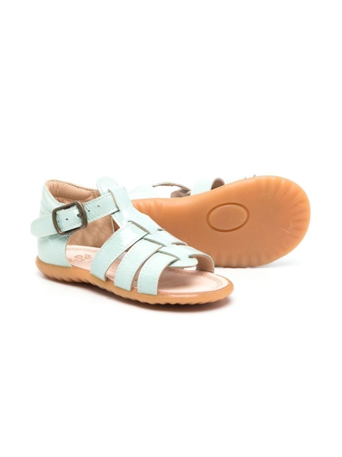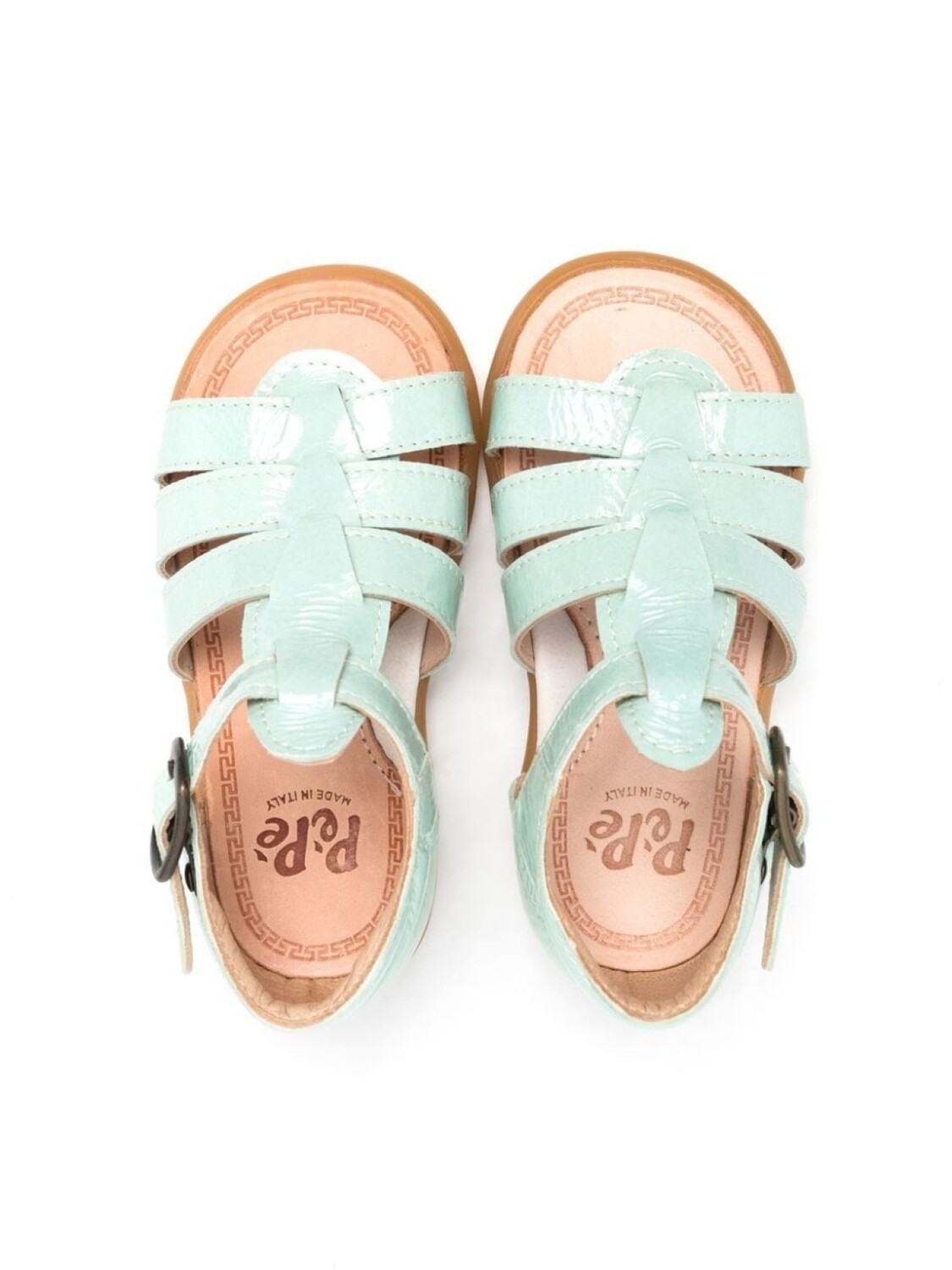 Мятно-зеленый, лакированная кожа, несколько вариантов крепления ремня, открытый носок, застежка с пряжкой спереди и плоская резиновая подошва.