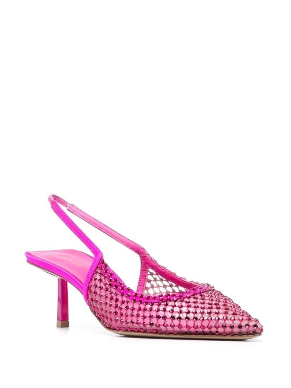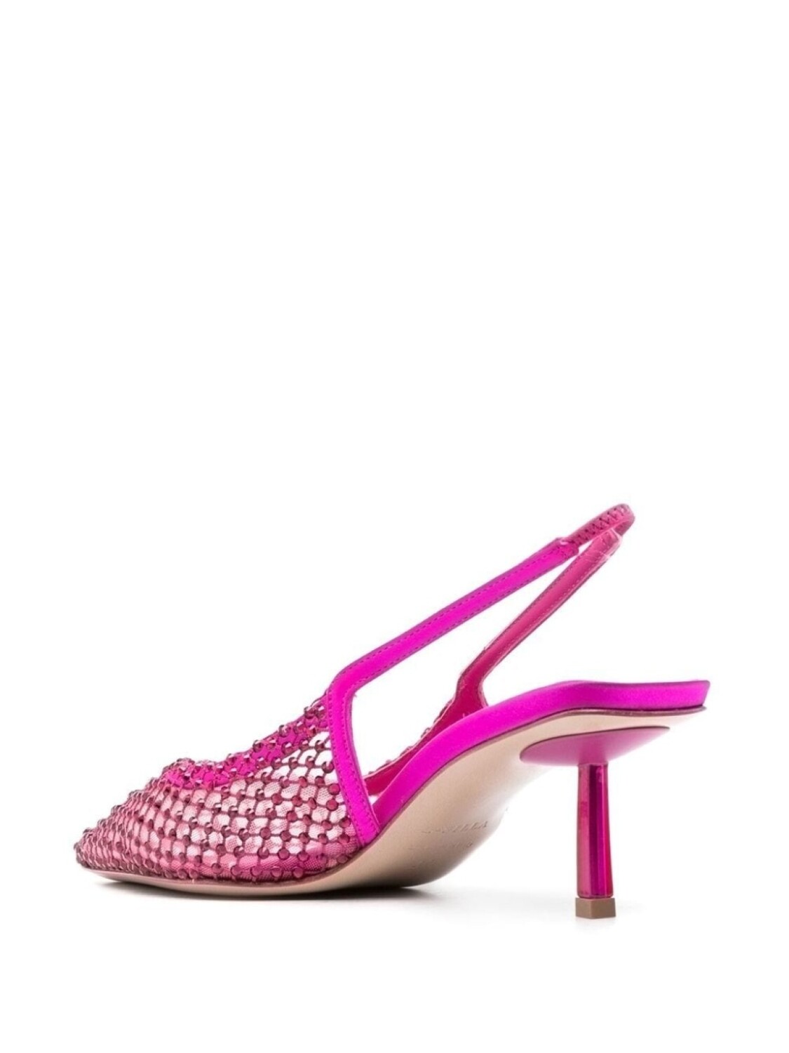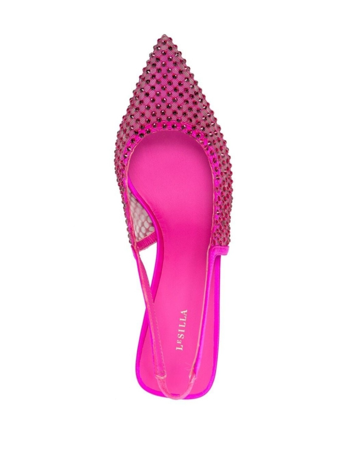 Атласная отделка, декор из стеклянных кристаллов, сетка, эластичный ремешок на пятке, кожаная стелька с логотипом, заостренный носок, плоская резиновая подошва и каблук средней высоты.