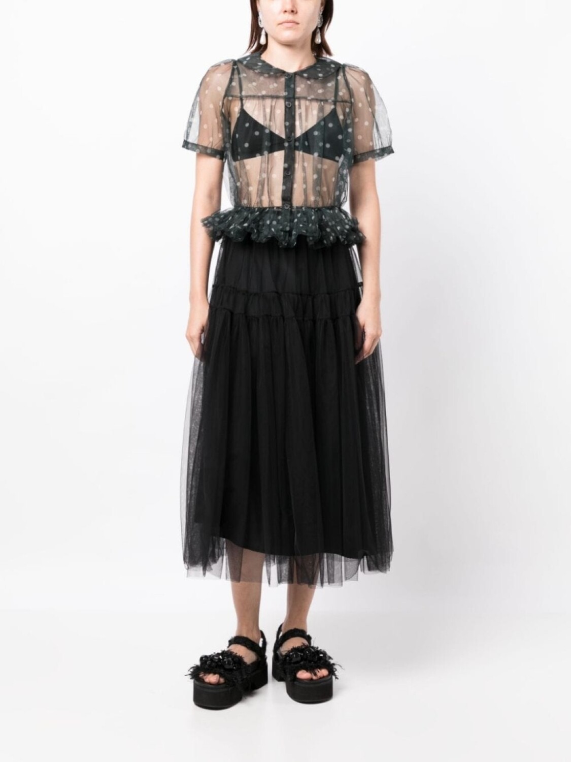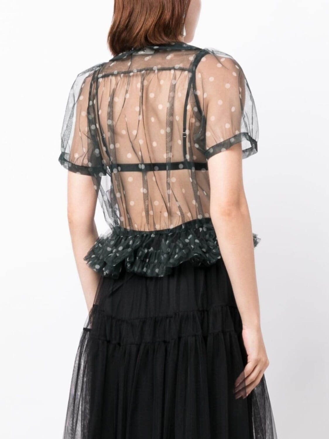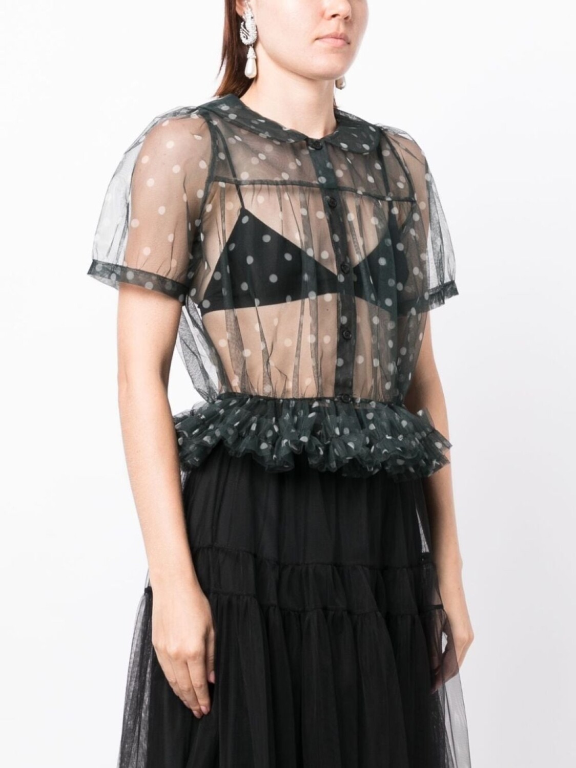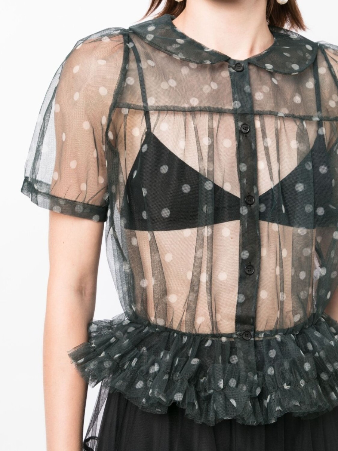 Черный, принт в горох, прозрачное покрытие, вставки с оборками, воротник Питер Пэн, приталенный силуэт, застежка на пуговицах спереди и короткие объемные рукава.