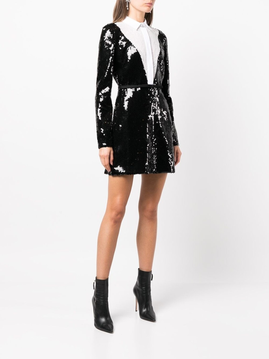Черный/белый, вставки из цветочного кружева, классический воротник, украшение из поделочных камней, планка на пуговицах спереди, пайетки и приталенный силуэт.