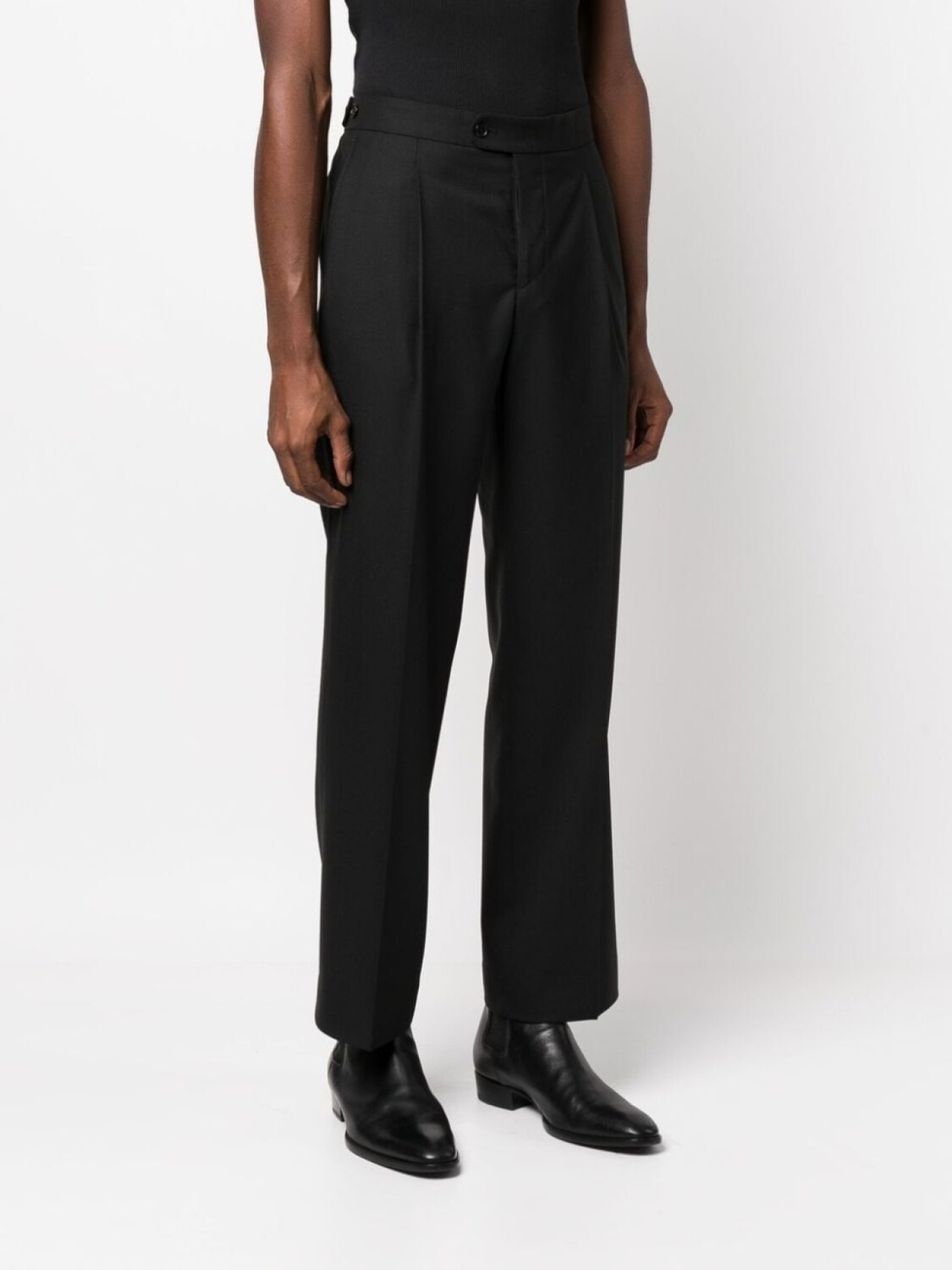Черный, строгий крой, прямой крой, укороченная длина, средняя посадка, стрелки, потайная застежка спереди, два кармана по бокам и два прорезных кармана на пуговицах сзади.