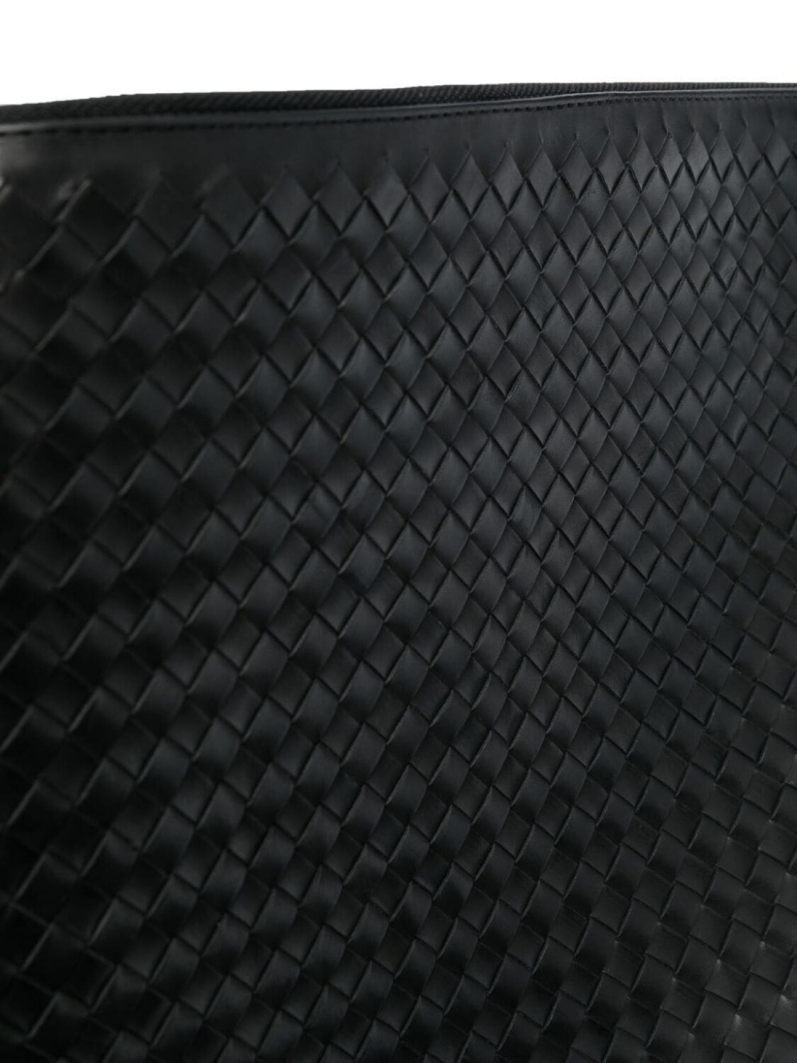 Черный, телячья кожа, застежка на молнии сверху, основное отделение и переплетенный дизайн.