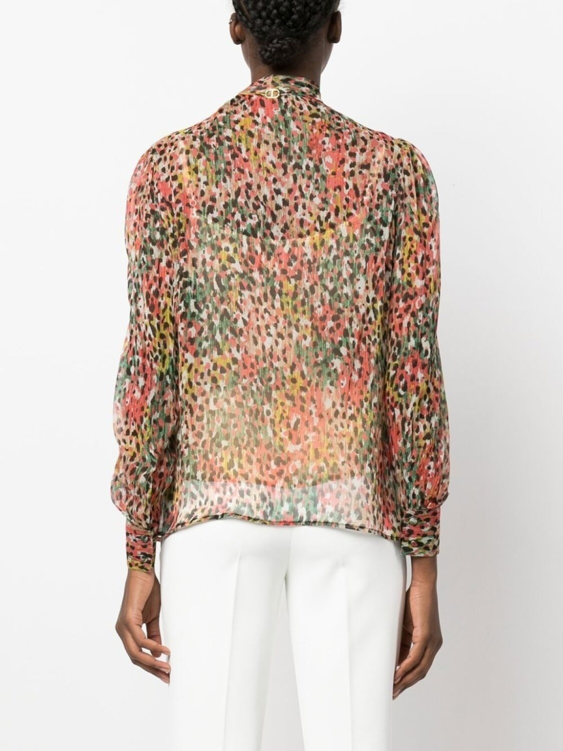 Разноцветный, полупрозрачный дизайн, анималистичный принт, воротник с бантом, застежка на пуговицах спереди, объемные рукава, манжеты на пуговицах и прямой подол.