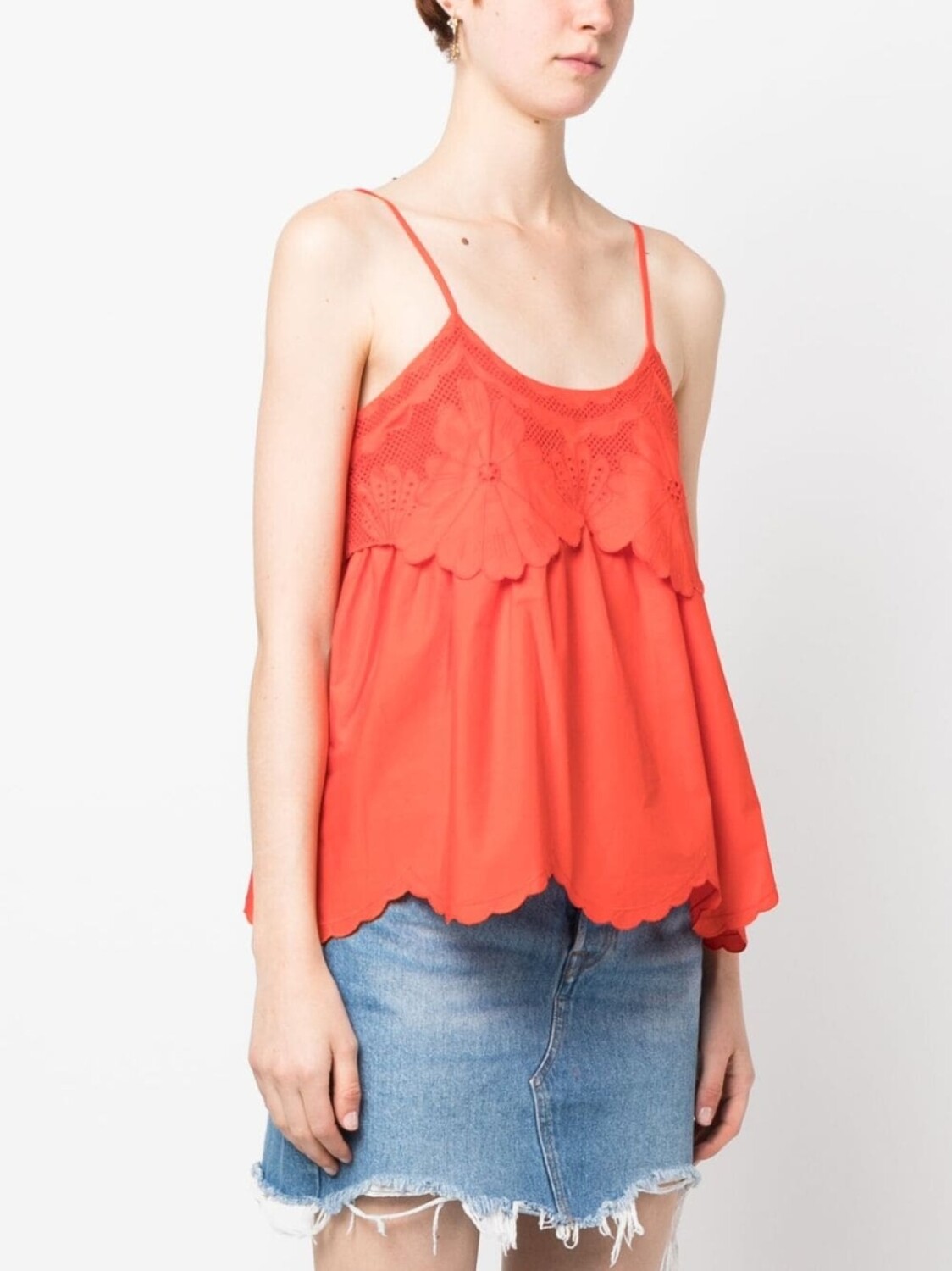 Оранжево-красный, хлопок, поплин, английская вышивка, цветочный узор, дизайн со сборками, круглый вырез, тонкие бретели и подол с фестонами.