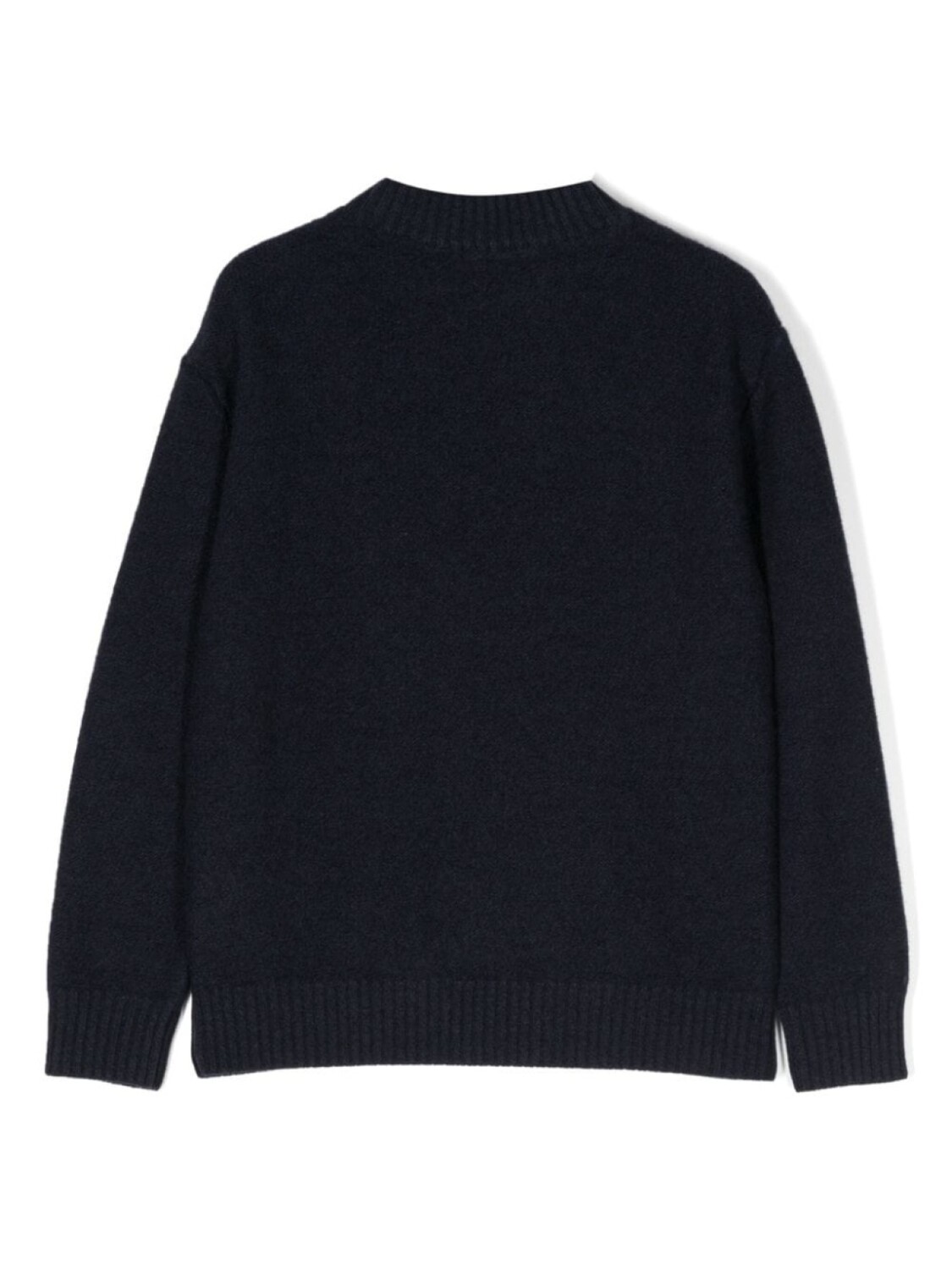 Темно-синий, смесь шерсти и кашемира, фактурная вязка, круглый вырез, длинные рукава и прямой подол.