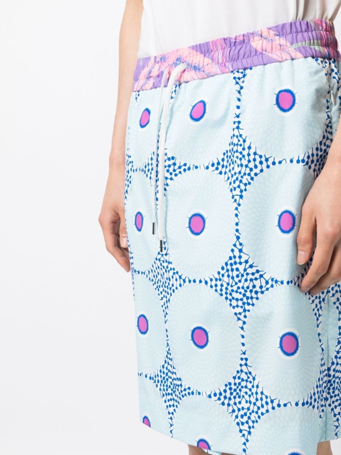 Голубой, сплошной графичный принт, модель на запах, низкий шаговый шов, длина выше колена, два кармана на молнии по бокам и кулиска на талии.