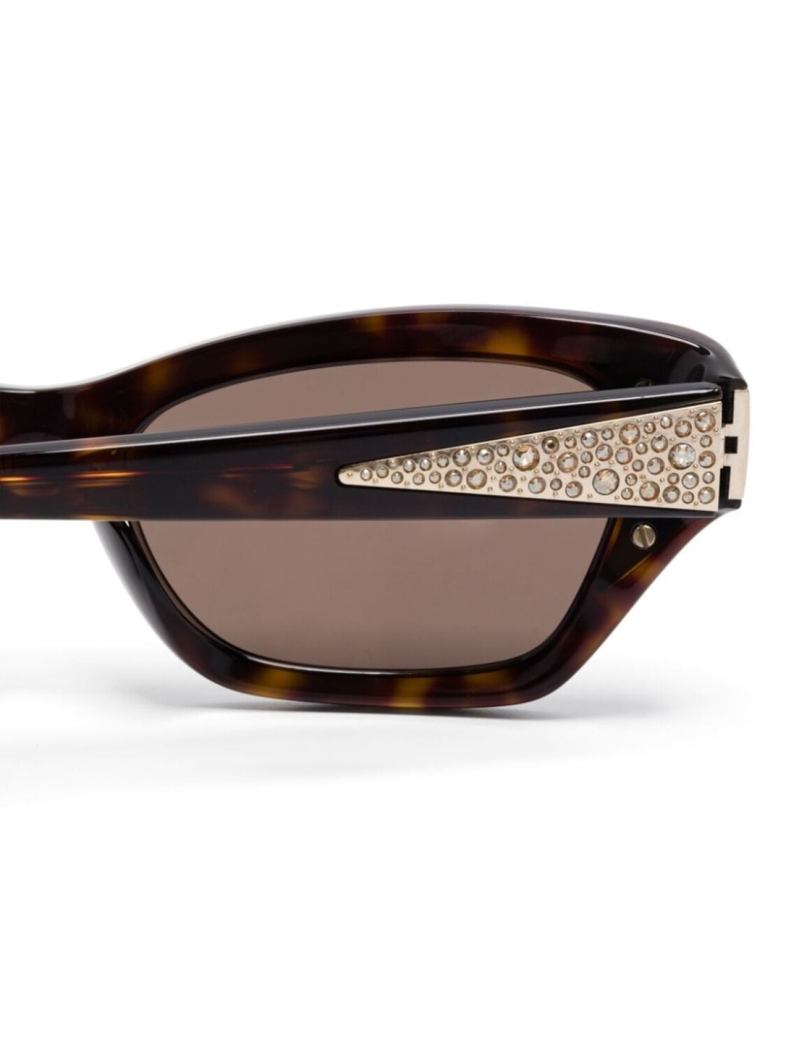 Коричневый, отделка кристаллами Swarovski, эффект черепашьего панциря, оправа «кошачий глаз», коричневые линзы, защитная пленка с логотипом, прямые дужки, дужки с закругленными концами, концы с гравировкой логотипа, В комплект входит защитный чехол для очков.