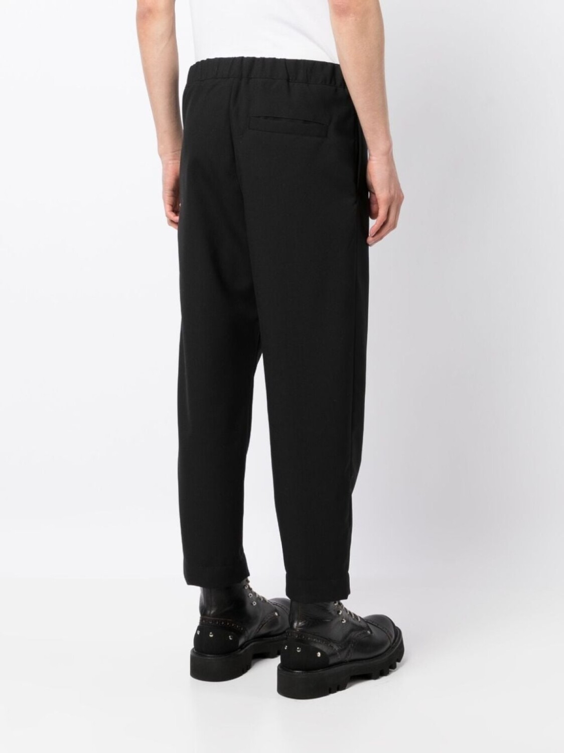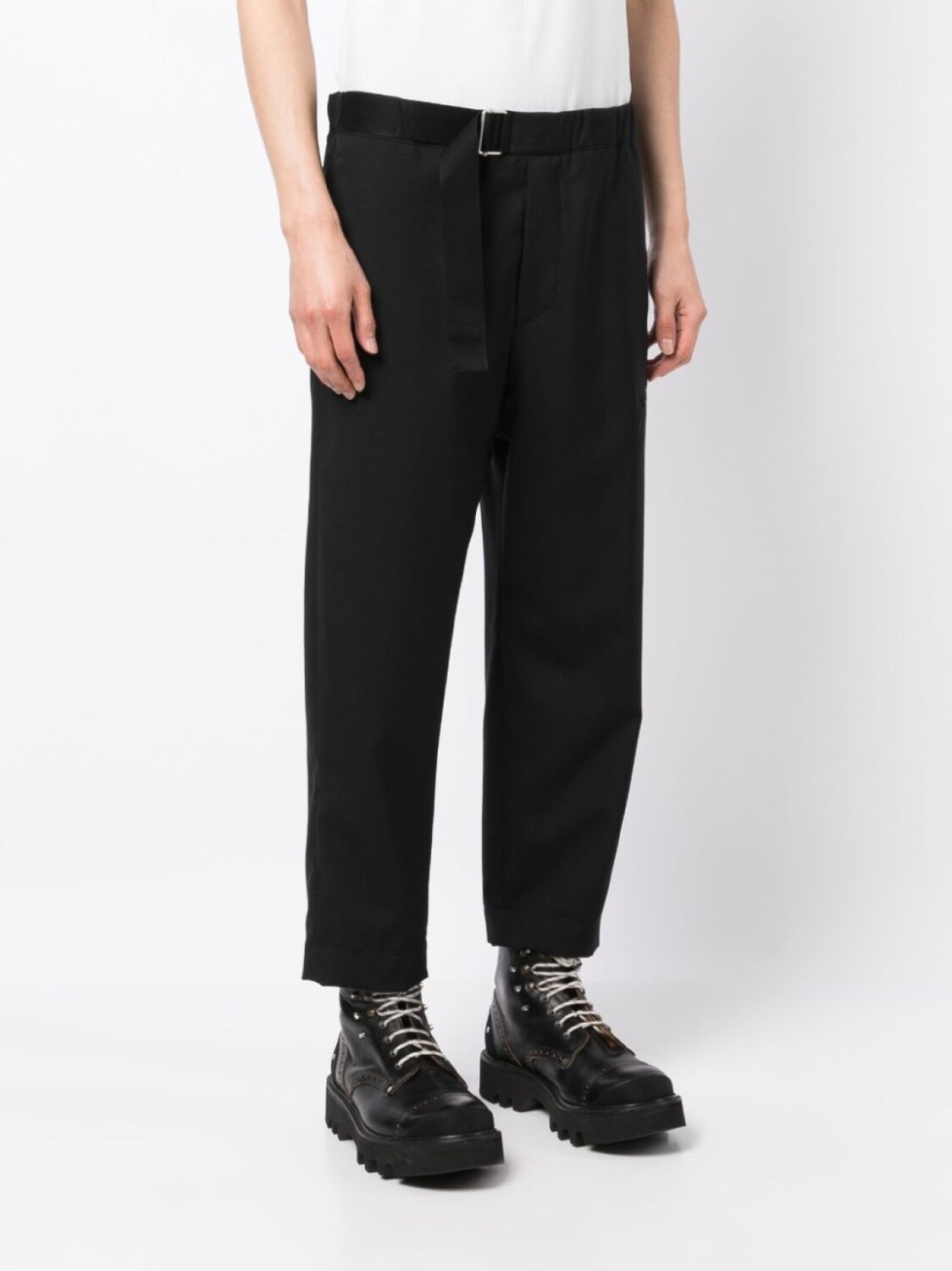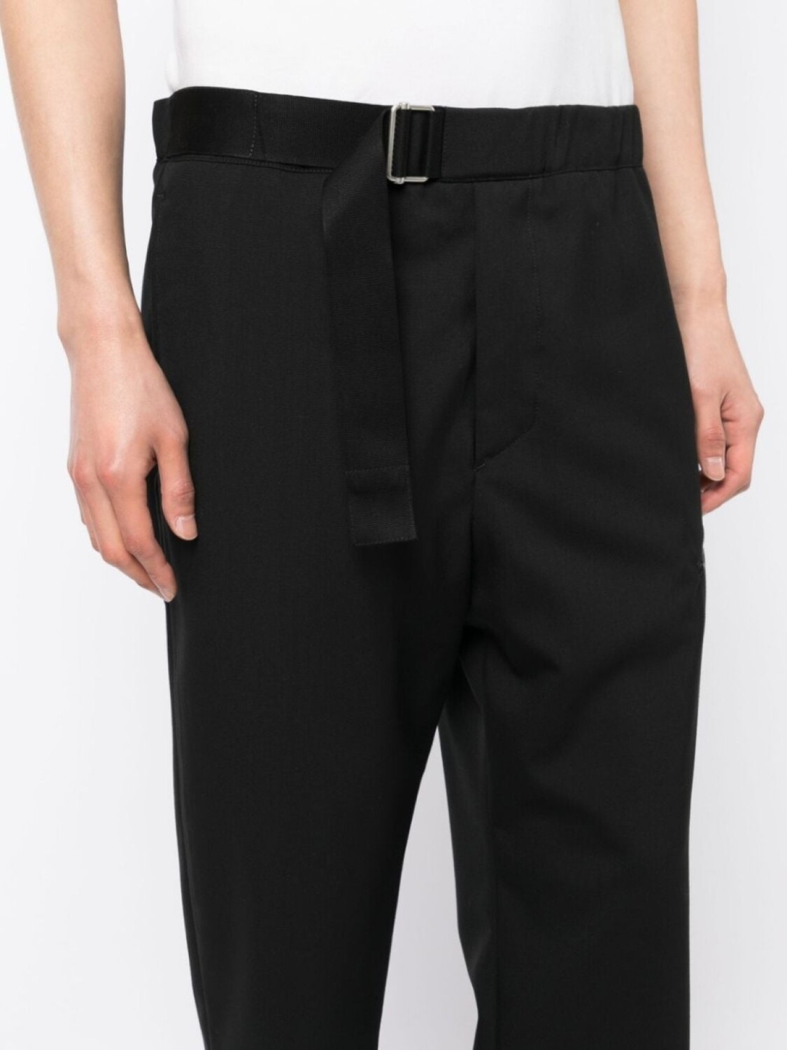 Черный, хлопок, зауженный крой, укороченная длина, эластичный пояс сзади, ремень на талии, застежка на молнии спереди, два вшитых кармана по бокам и задние карманы с листочкой.