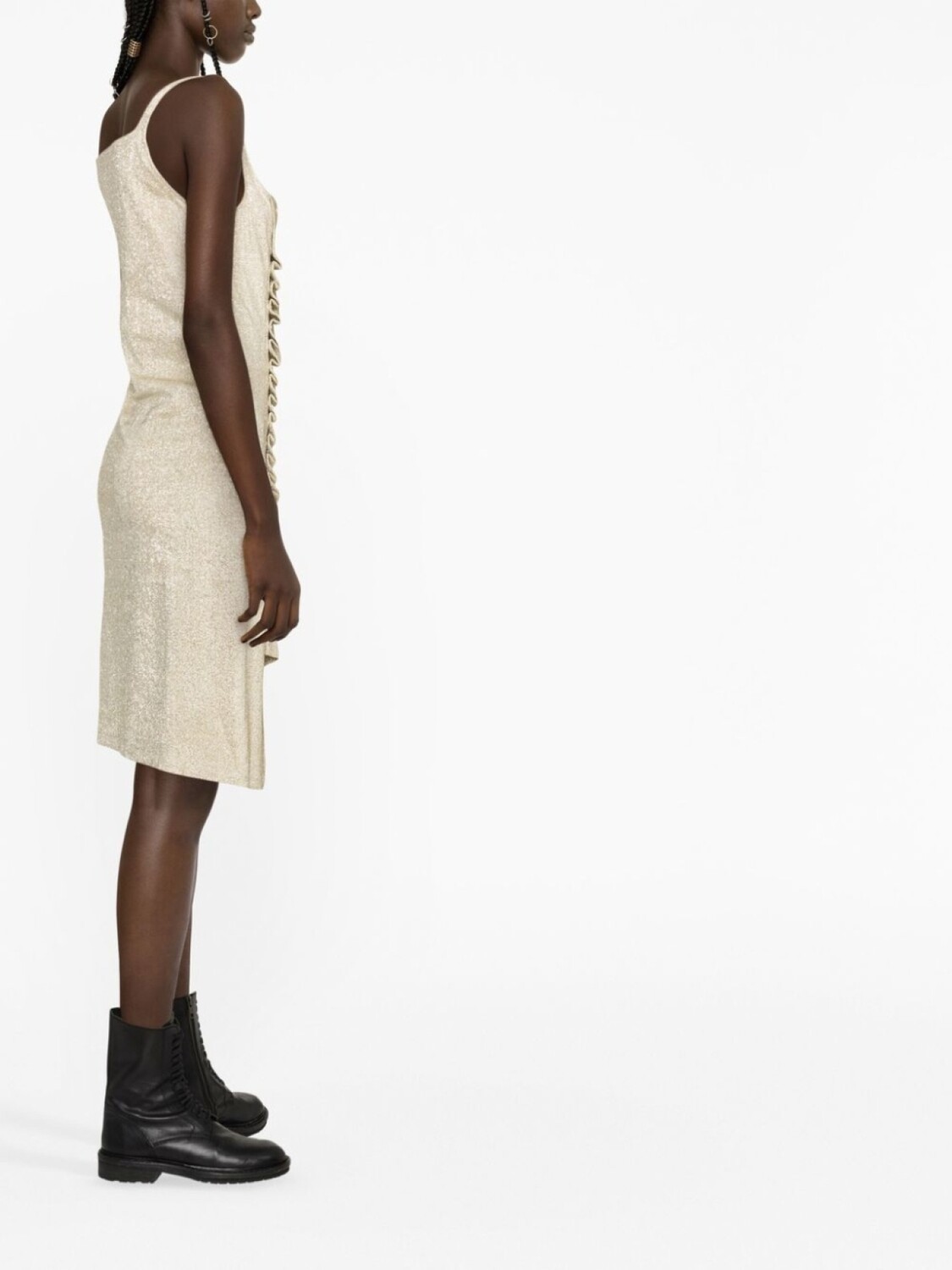 Золотистый, эффект металлик, детали с оборками, U-образный вырез и без рукавов.