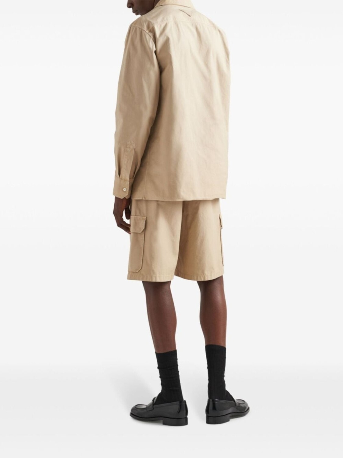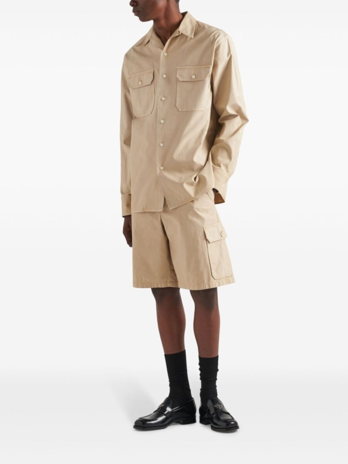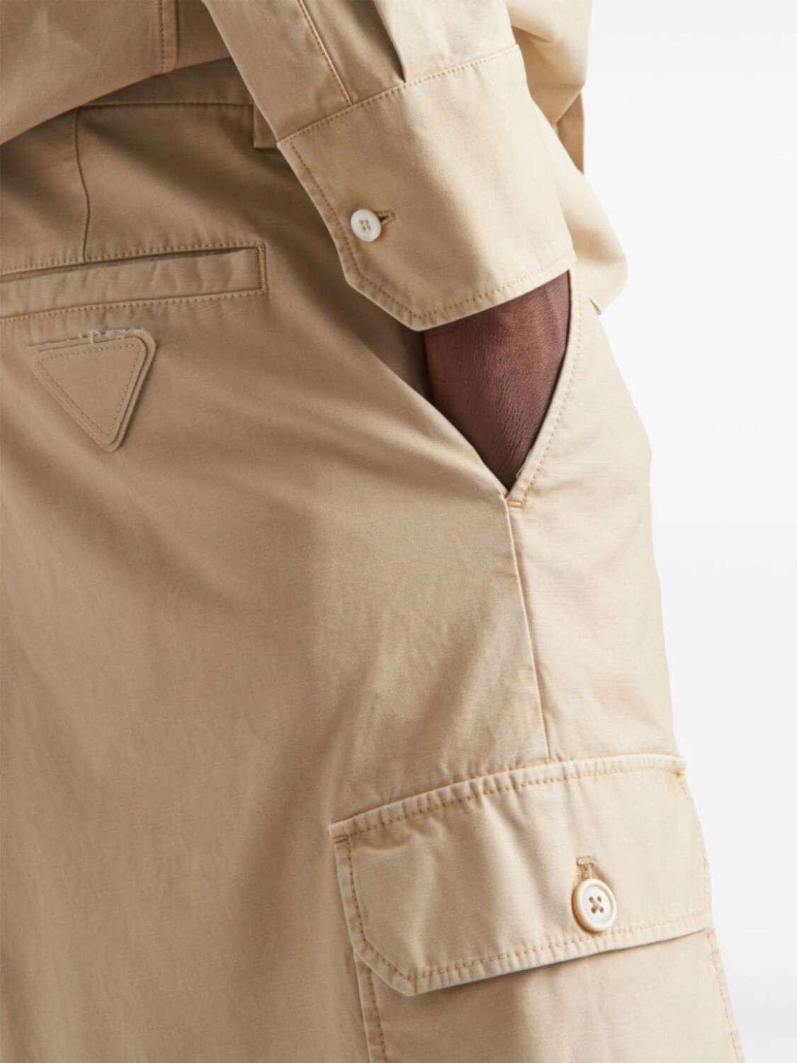Бежевый хлопок, потайная застежка на пуговицы, крючок и молнию спереди, шлевки для ремня, два боковых прорезных кармана, два боковых кармана-карго, два задних прорезных кармана, треугольный логотип, длина до колена