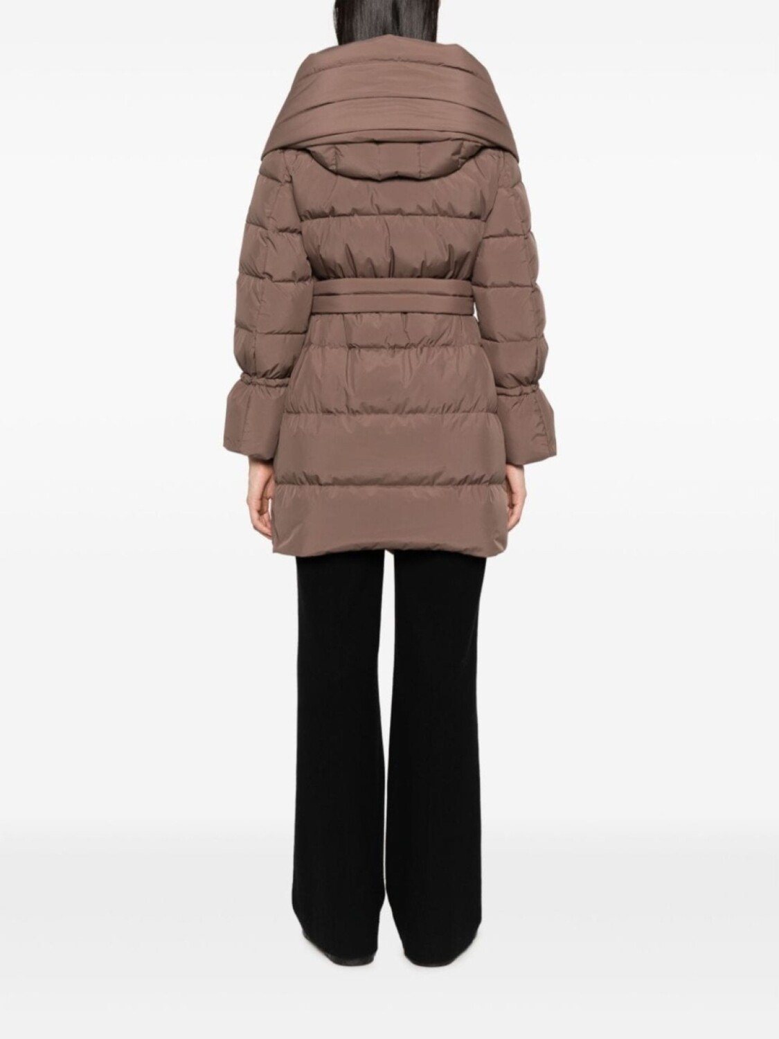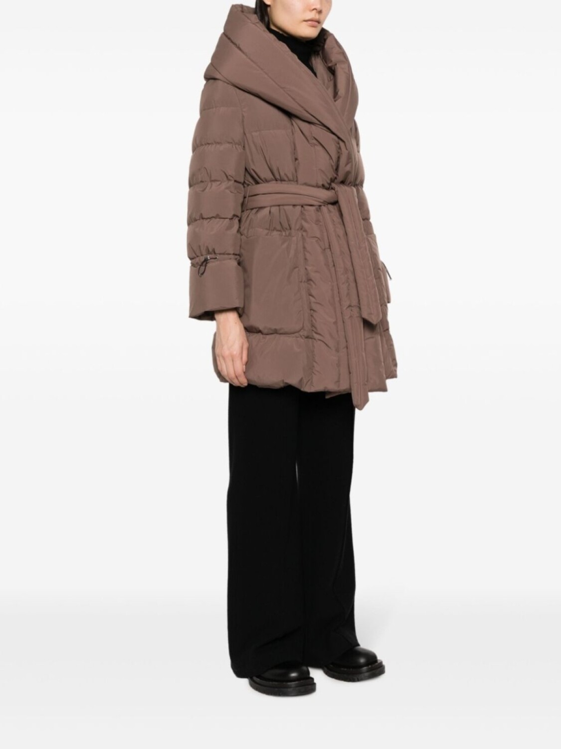 Коричневый, наполнитель из смеси пуха и пера, высокий воротник, длинные рукава, ремень на талии, два накладных кармана, дутый материал, манжеты с кулиской, прямой подол и классический капюшон.