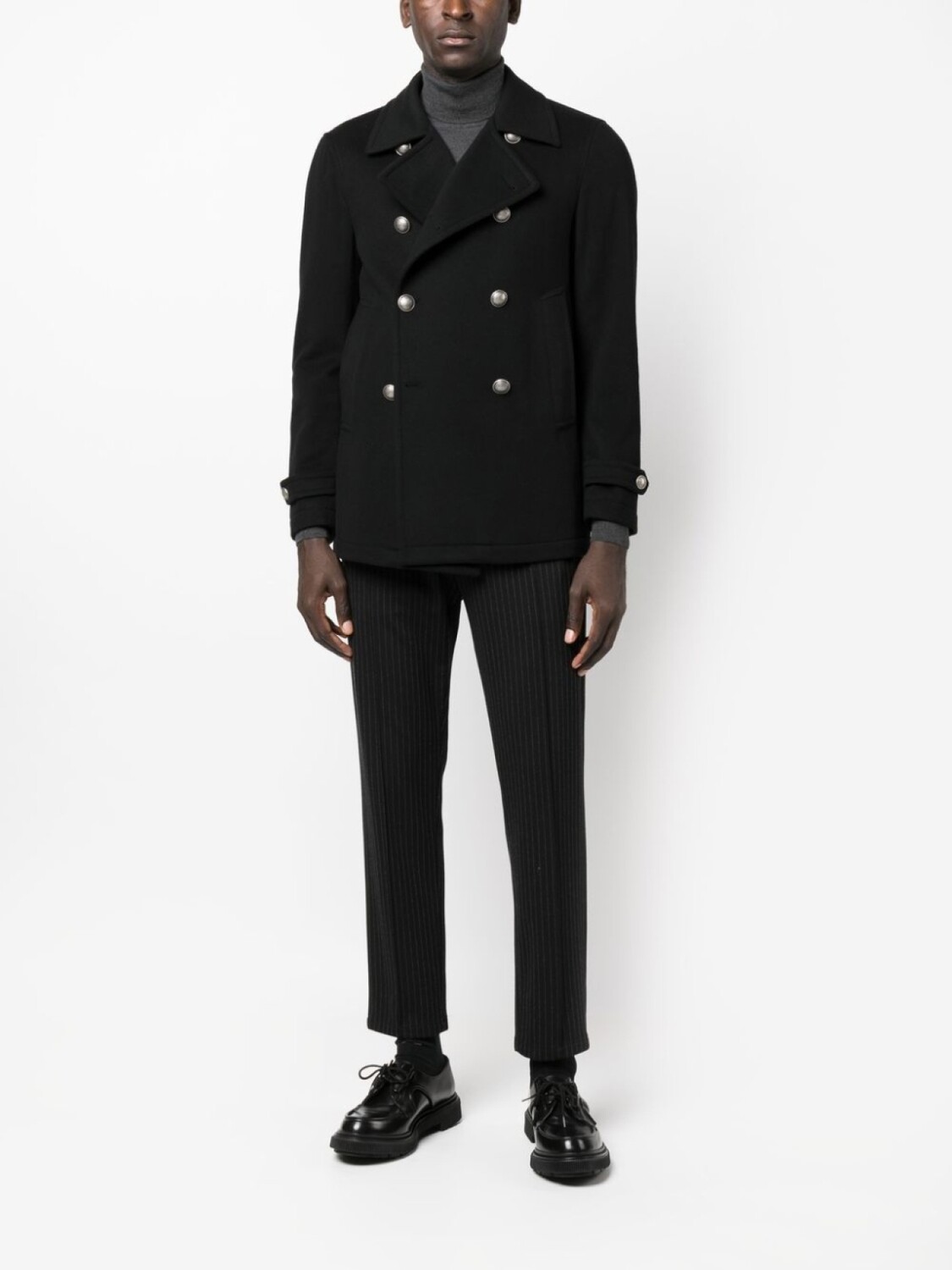 Черный, смесь шерсти и кашемира, двубортная застежка на кнопки, золотистые пуговицы, зазубренные лацканы, манжеты на пуговицах, два прорезных кармана сбоку, длинные рукава, шлица по центру сзади и прямой подол.