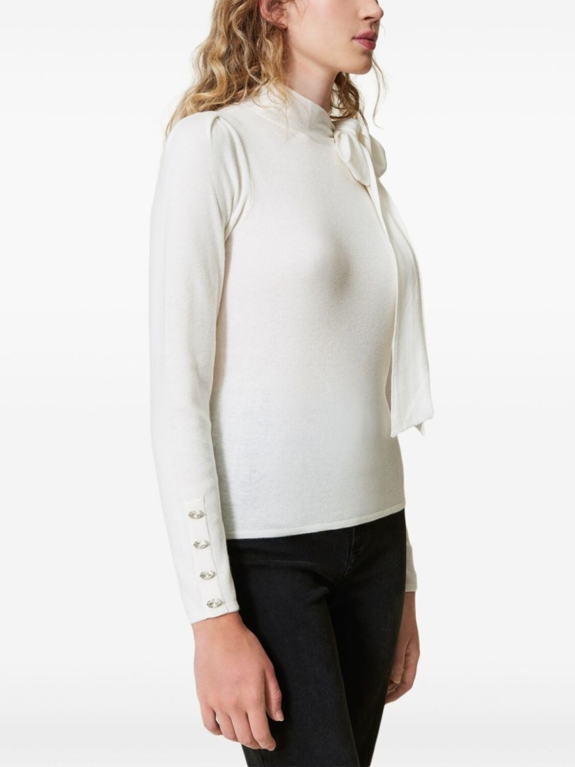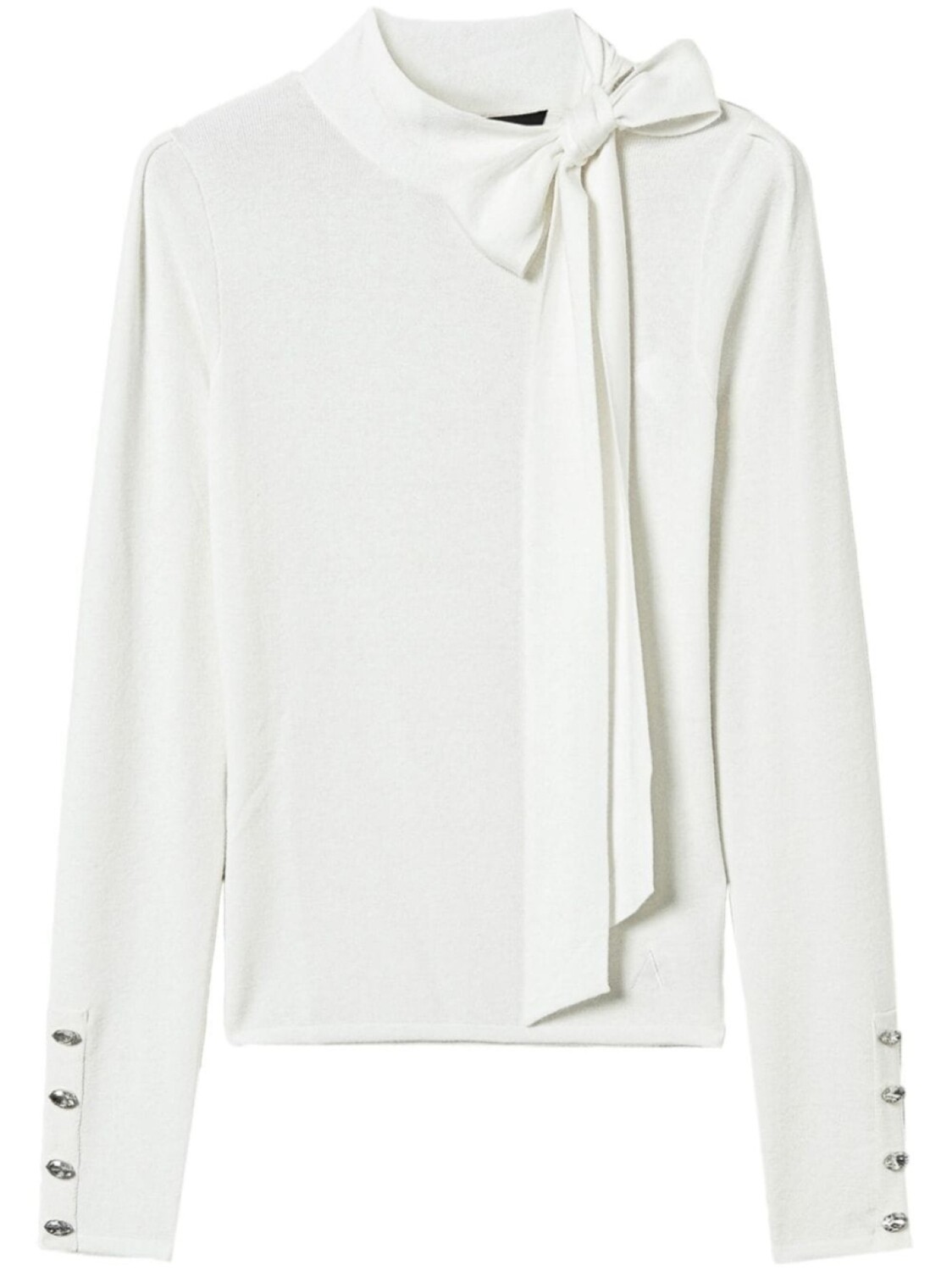 Белая трикотажная конструкция, высокий воротник, отделка бантом, длинные рукава, украшенные кристаллами пуговицы, прямой подол