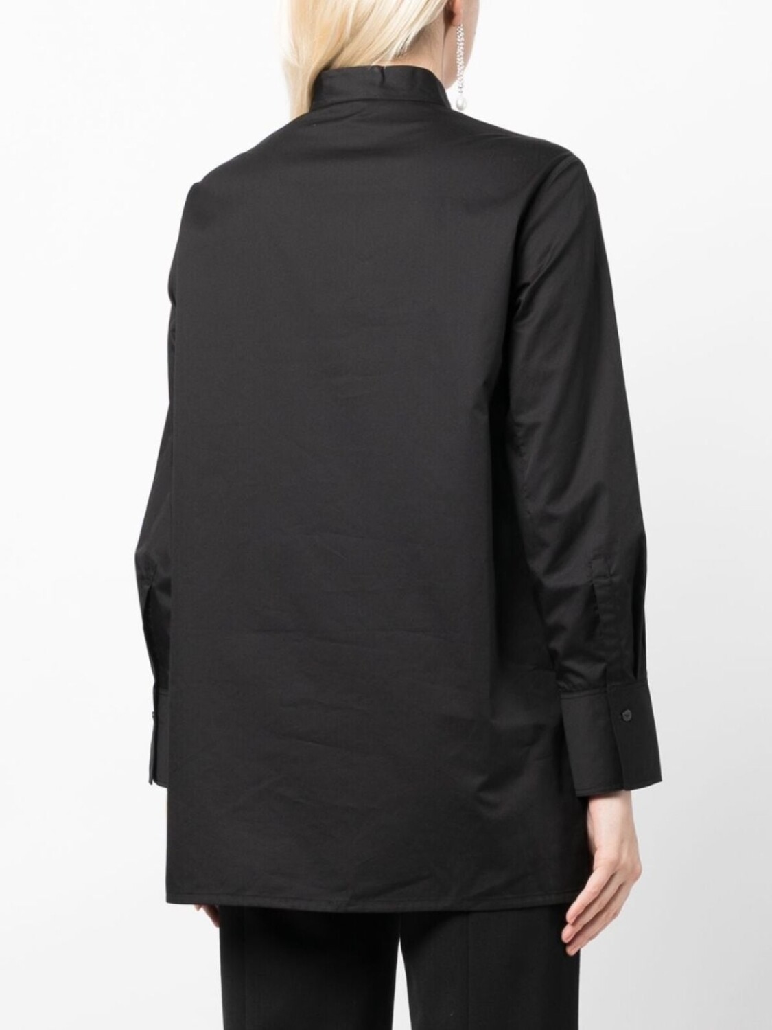 Черный, смесовый хлопок, вставки из кружева, воротник-стойка, потайная застежка спереди, длинные рукава, рукава с манжетами на пуговицах и прямой подол.